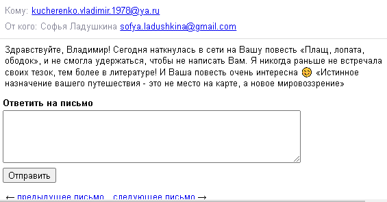 Автор: Кучеренко ВладимирВот такое письмо неожиданно получил: