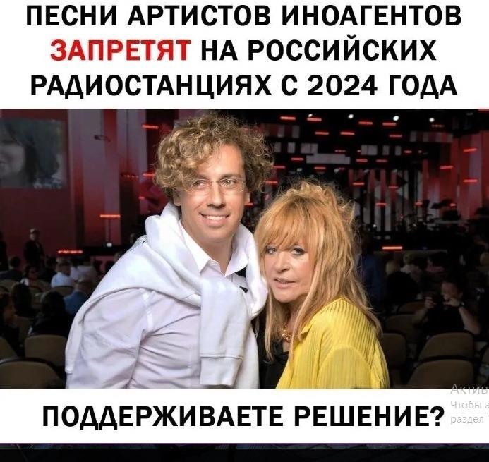 И ещё. Именно про этих людей. Последние выступления "примадонны" не смотрел и не слушал её хриплых хитов. А вот её первые песни, когда она только делала на эстраде первые свои шаги, считаю шедевральными. И если у человека снесло мозги под старость, они же на стали от этого хуже? Зачем же их запрещать? И я буду слушать то, что мне нравится, пусть немного не совпадает по времени года, но отвечает моему внутреннему временному состоянию. А от политики я далёк. И здесь попрошу её не приплетать.