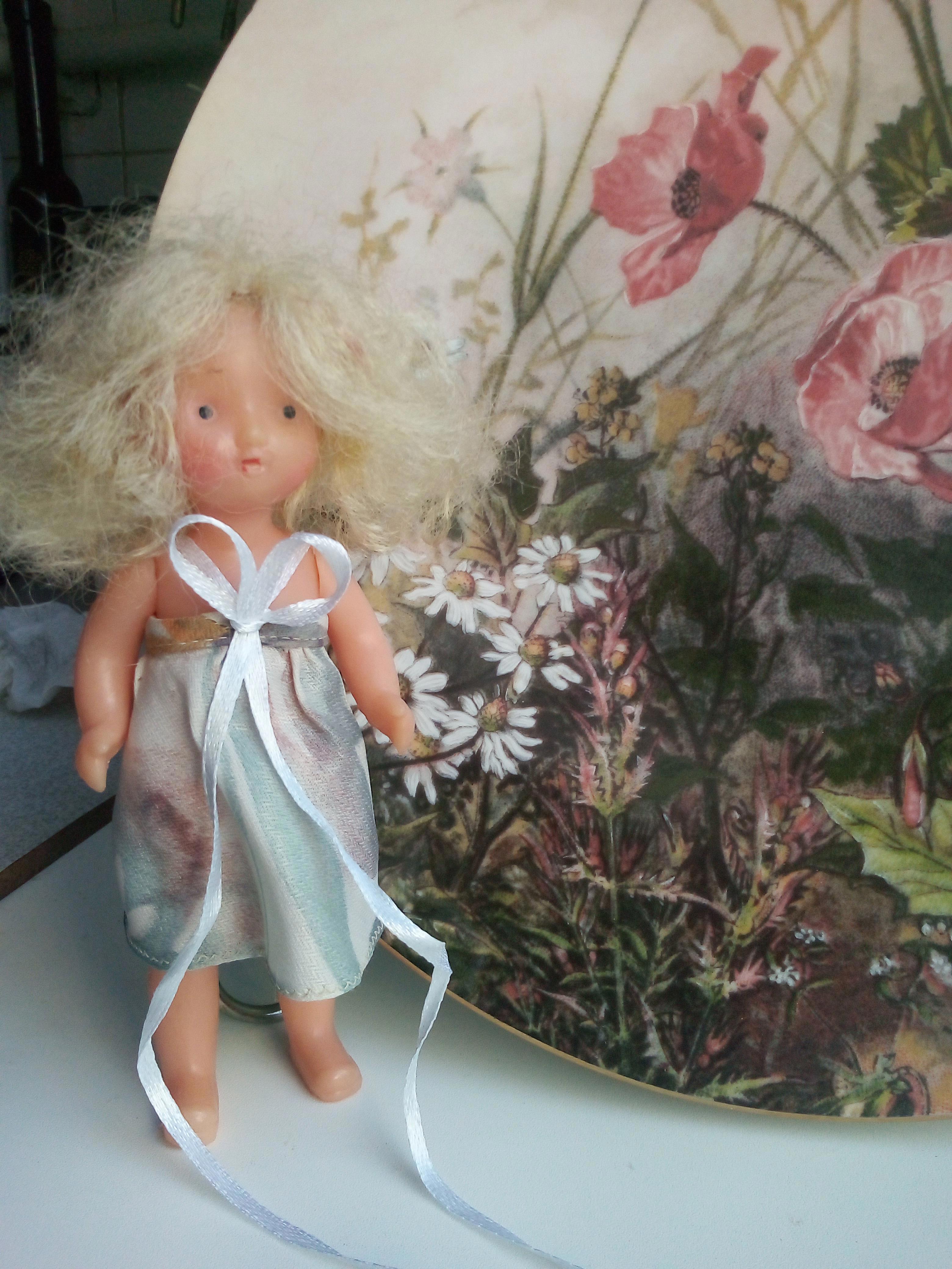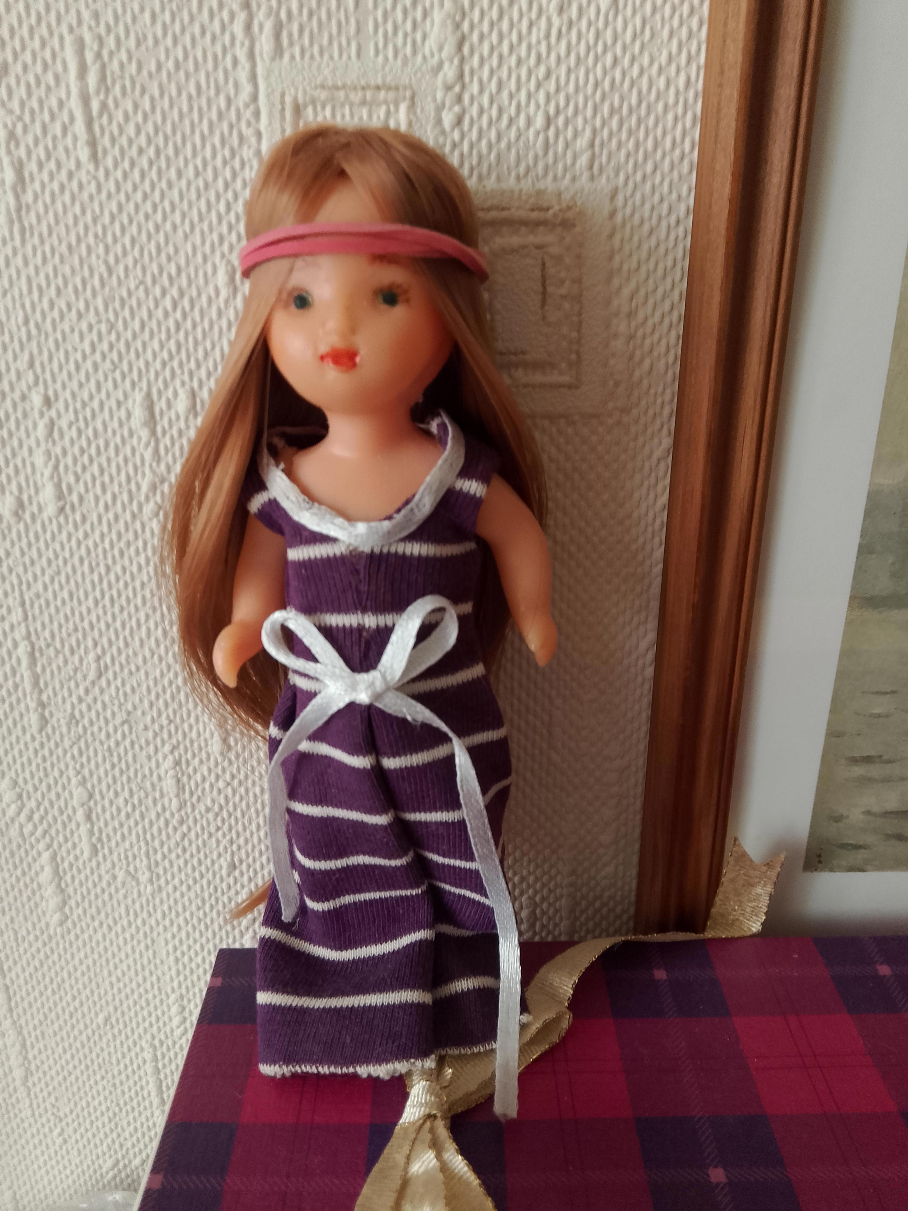 Попытка первая, ученическая. Куколка крохотная, 9.5 см в высоту, треть от стандартной Барби. Куплена была в детстве в каком-то киоске, несколько десятков лет валялась на даче в коробках. Была найдена и отложена до творческих идей. Это первая моя попытка перерисовать лицо и сделать парик.