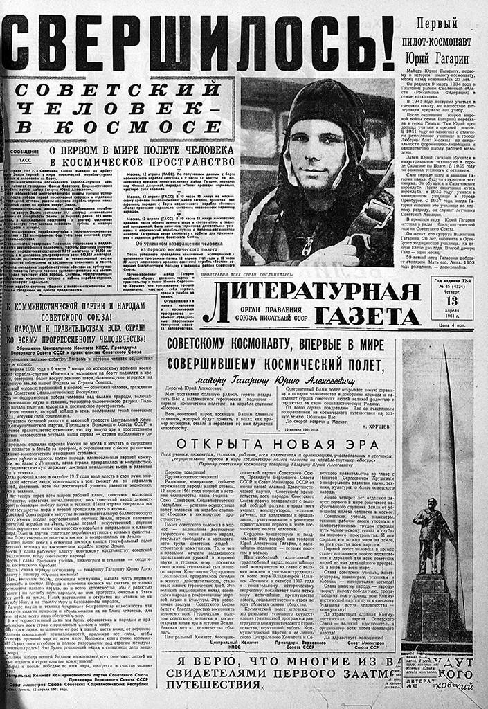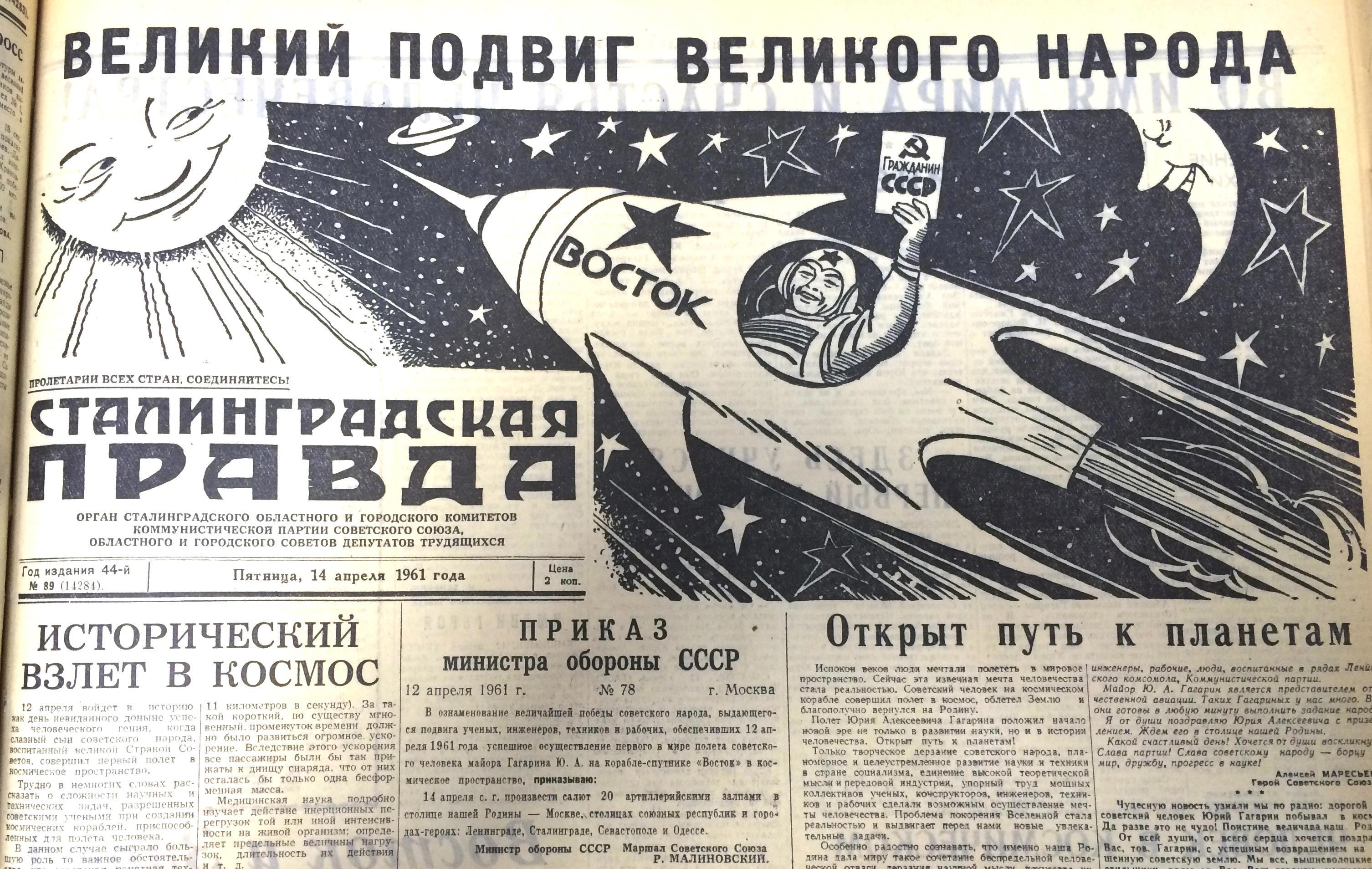 В 1961 году гражданин Советского Союза Юрий Алексеевич Гагарин стал первым, кто совершил полет в космос. Облетев орбиту земного шара на космическом корабле «Восток», советский первооткрыватель начал новую эпоху космических полетов с человеком на борту. Полёт Гагарина занял 108 минут, после чего его корабль приземлился в запланированном месте в 10 часов 55 минут по московскому времени близ деревни Смеловка в Саратовской области.