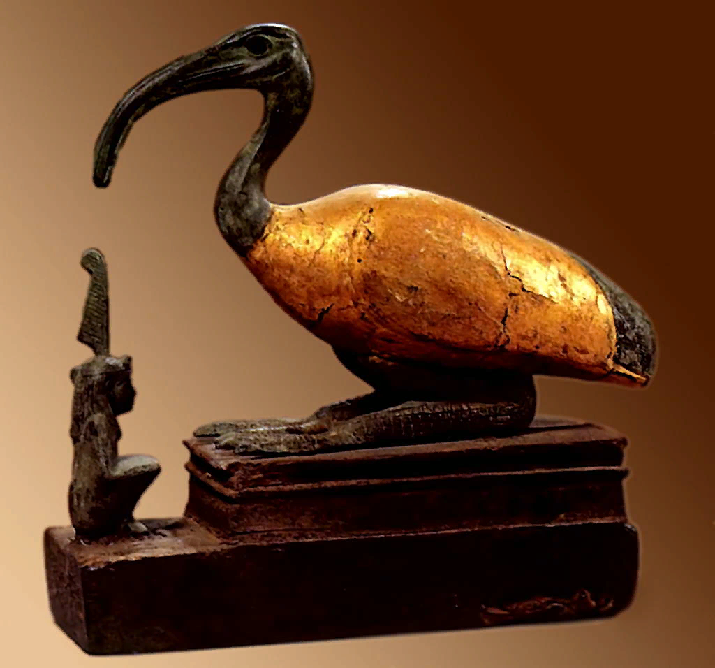 (Бог Тот в виде ибиса и маат с пером страуса перед ним).