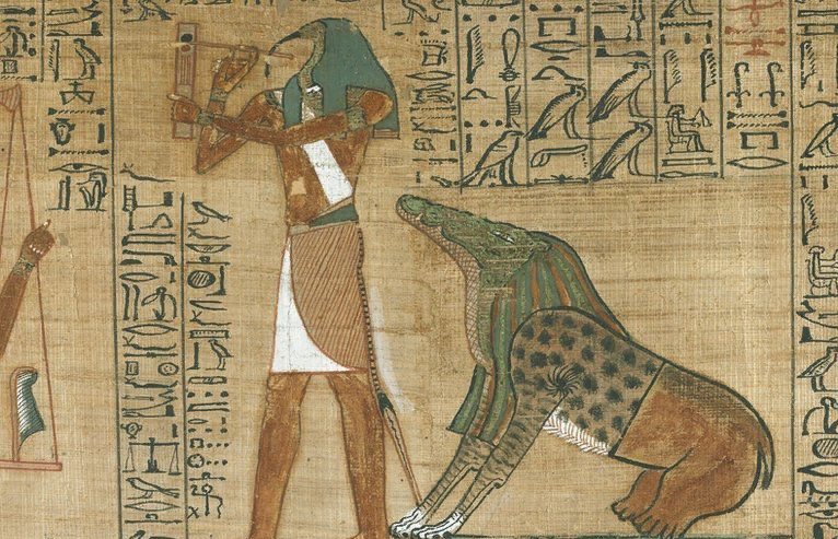 (Амат (Амт, Амамат) («пожирательница») — чудовище, совмещавшее черты крокодила и льва. Считалось, что Амат обитает в Дуате (подземном царстве). Сердце умершего взвешивает бог Тот).