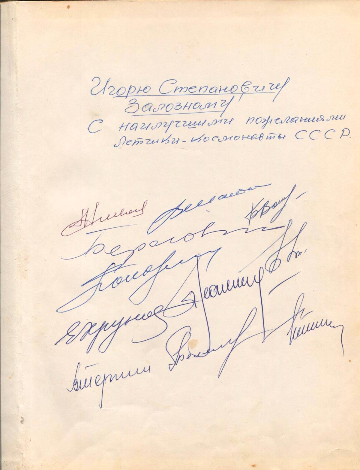 Собрал их загадочный Игорь Степанович Залозный. Неужели он ездил по всему союзу и собирал эти автографы? Иле же он сумел подойти к группе космонавтов? Или же он один из инженеров, создававших космическую технику? И главную подпись он не получил, потому что Гагарин уже тогда погиб?