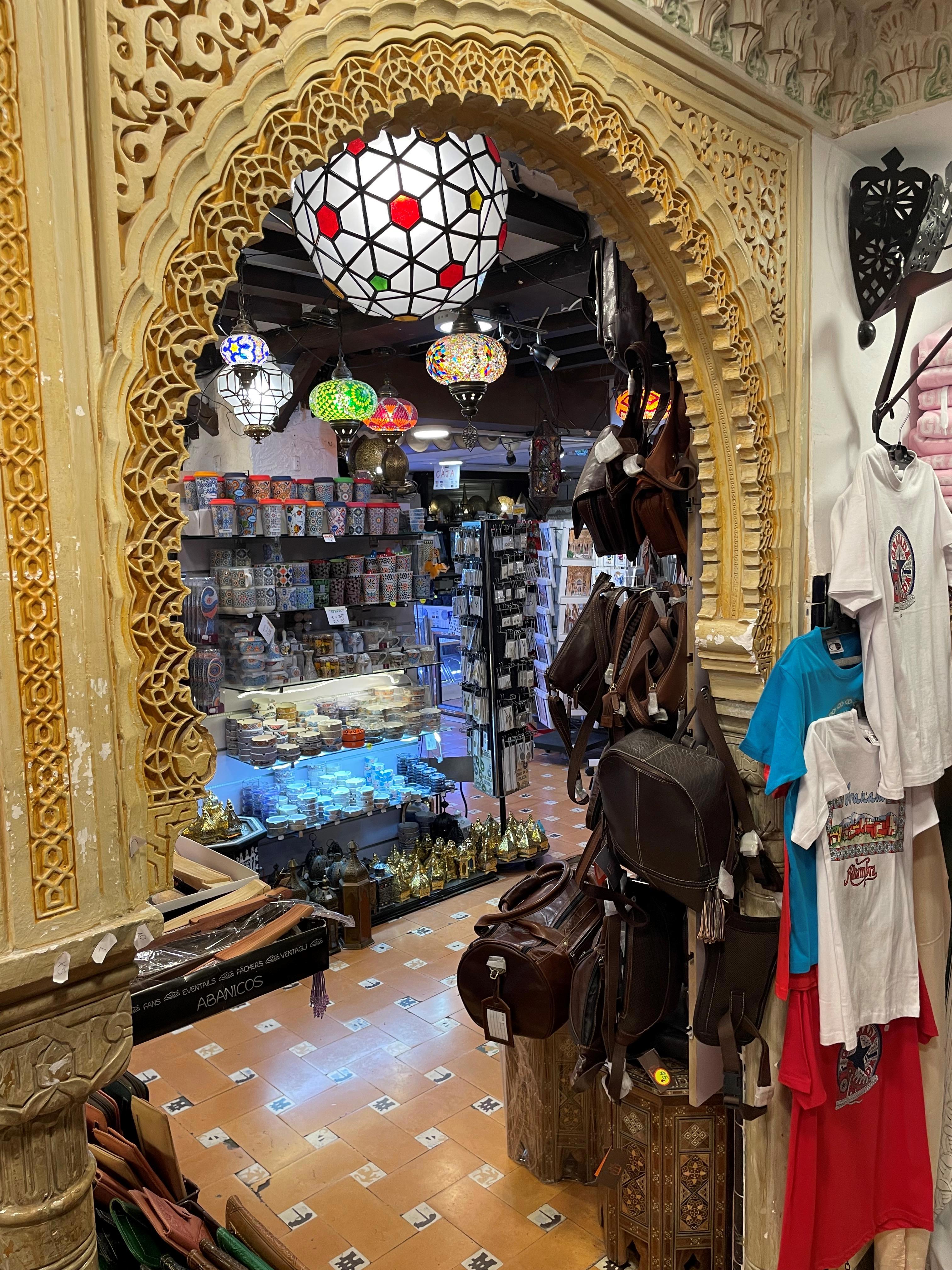 наша прекрасная мощеная узорами улочка удачно выходит на улочку с арабскими штучками: сувениры, кофе, сладости, еда посерьезней. сувенирные лавки - то, что вы видели до них, это ничто. это целые музеи с внутренними богатствами, скрытыми в лабиринтах не одного этажа прекрасных зданий.