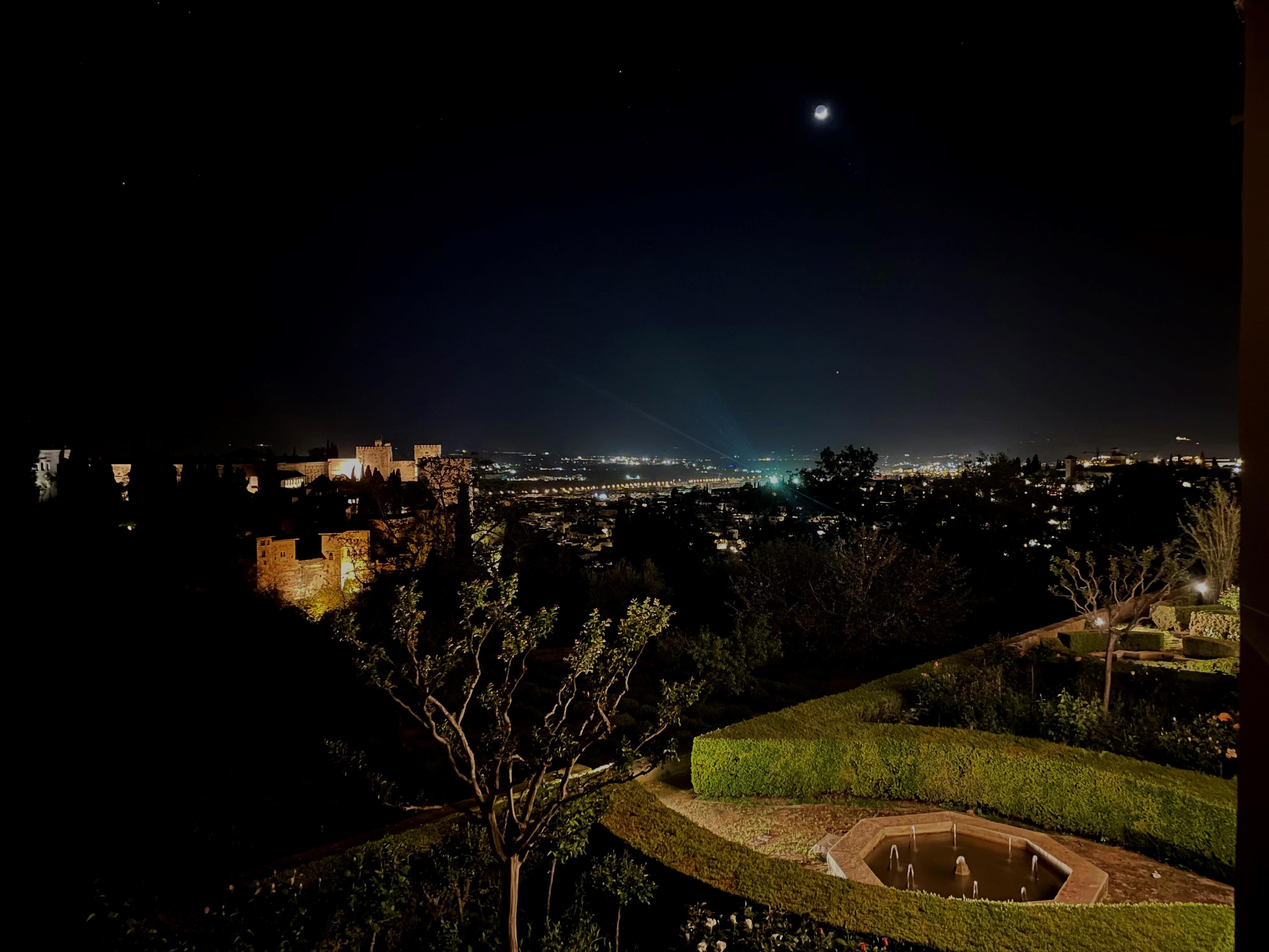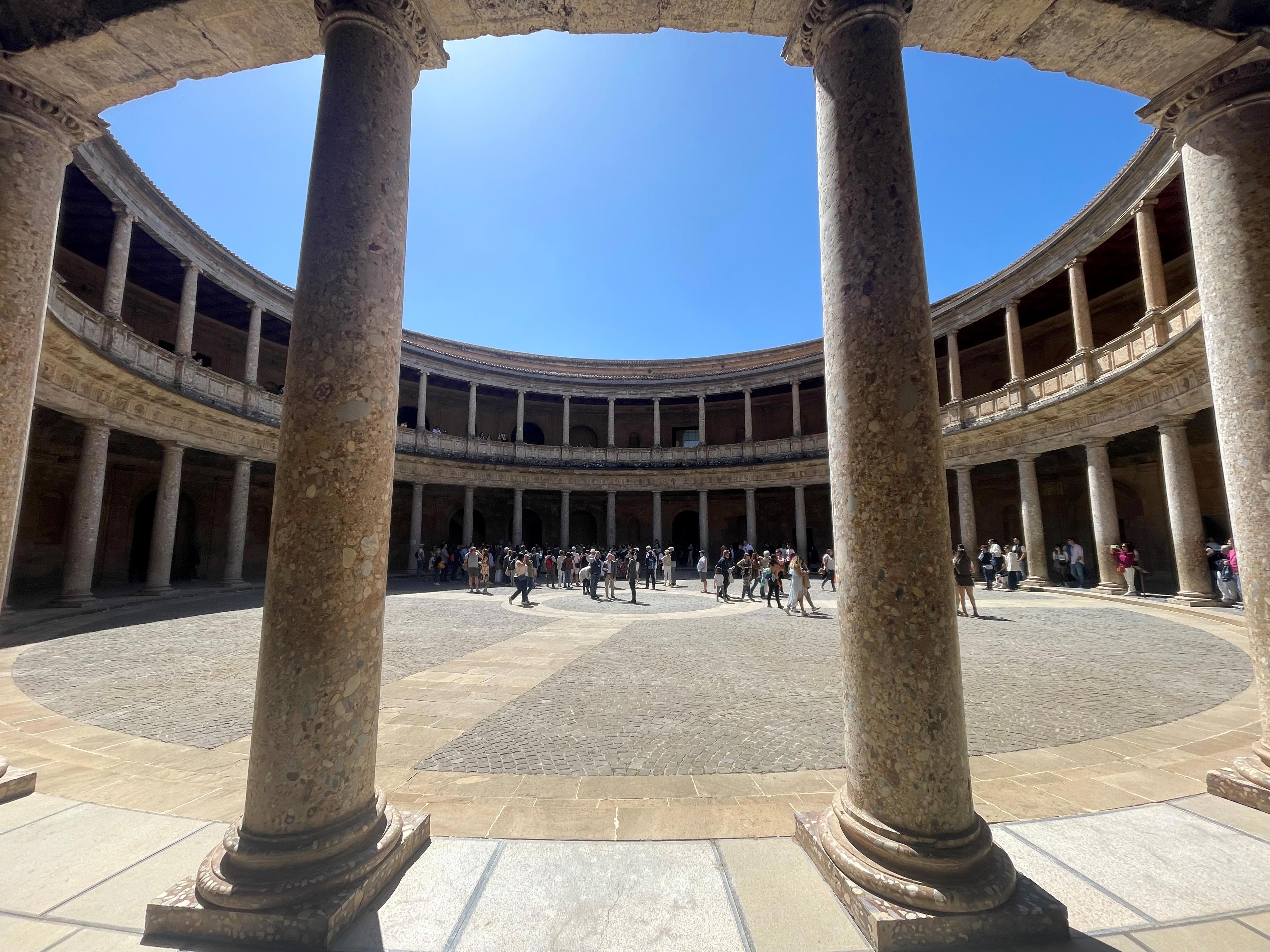 часть комплекса дворца можно посетить без билета, так что есть и дневные фото. это дворец Карлоса Пятого. Изабелле и Фердинанду - королевской паре, завоевавшей Андалузию и саму Гранаду - понравилась Альгамбра, так что и крепость Алькасаба, и арабский дворец Насридов, и часть садов Генералифе - все осталось. но достроился постепенно вот этот "христианский" дворец. он хорош, но... совершенно другой по сравнений с изящным мудехаром.