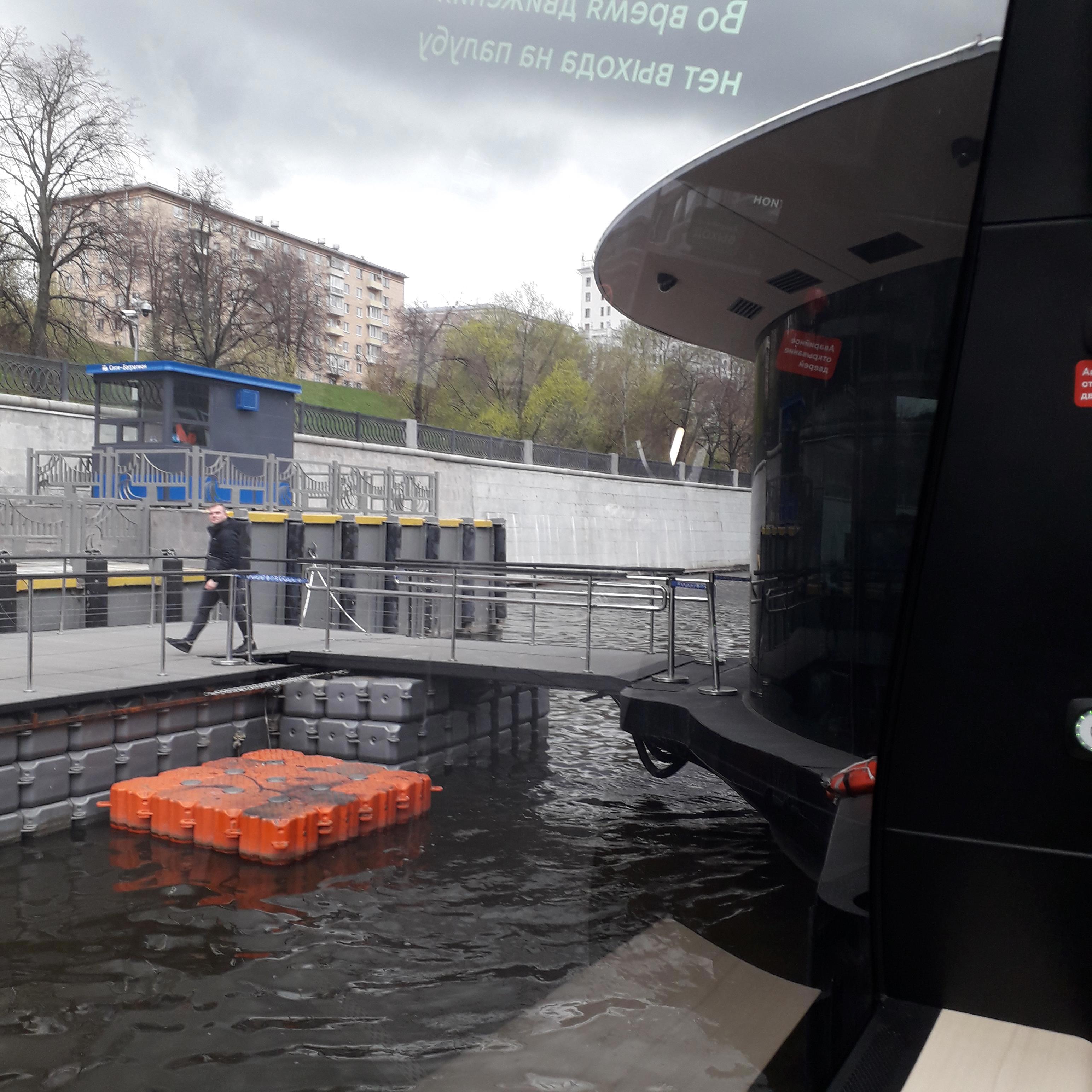 Сейчас на Москве-реке действуют два маршрута электросуден (в дальнейшем обещают еще пять). Мы отправлялись с пристани у Киевского вокзала, это первый маршрут. Как и ожидалось, на ближайший рейс мы не попали, только на следующий, - пассажиров пропускают по счету, по числу мест в трамвайчике. Но мы ждали не очень долго, перерыв между рейсами 25-30 минут (это время включает и спуск к пристани, и небольшой инструктаж перед отплытием).