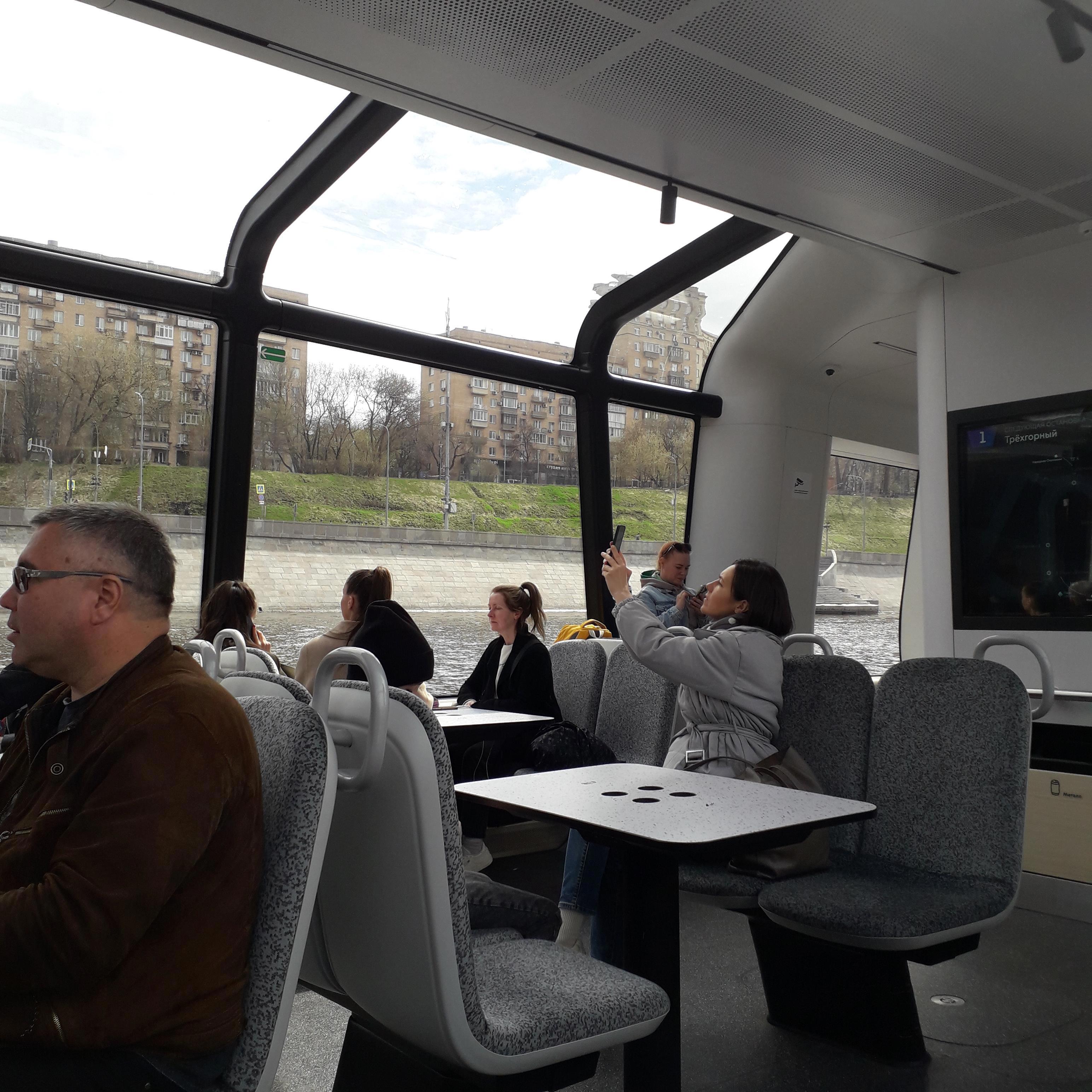 Это фото сделано в салоне, нос трамвайчика слева. Справа - большой экран, на котором показывали маршрут и крутили рекламные ролики о речном транспорте. Далее, с одной стороны - туалеты (современные, большие и чистые), с другой - кулеры с питьевой водой. В корме - небольшой закуточек, на два столика (по пять мест).