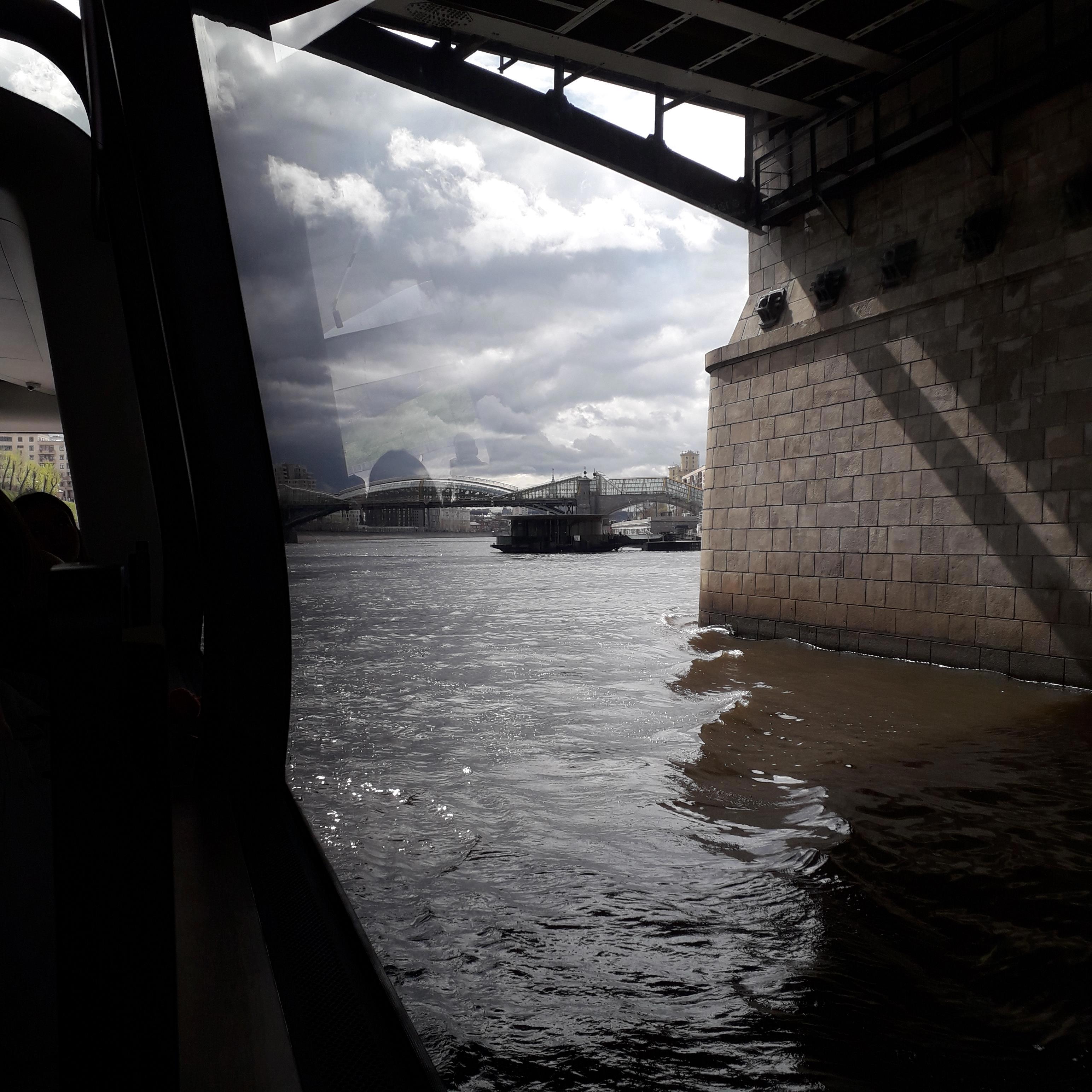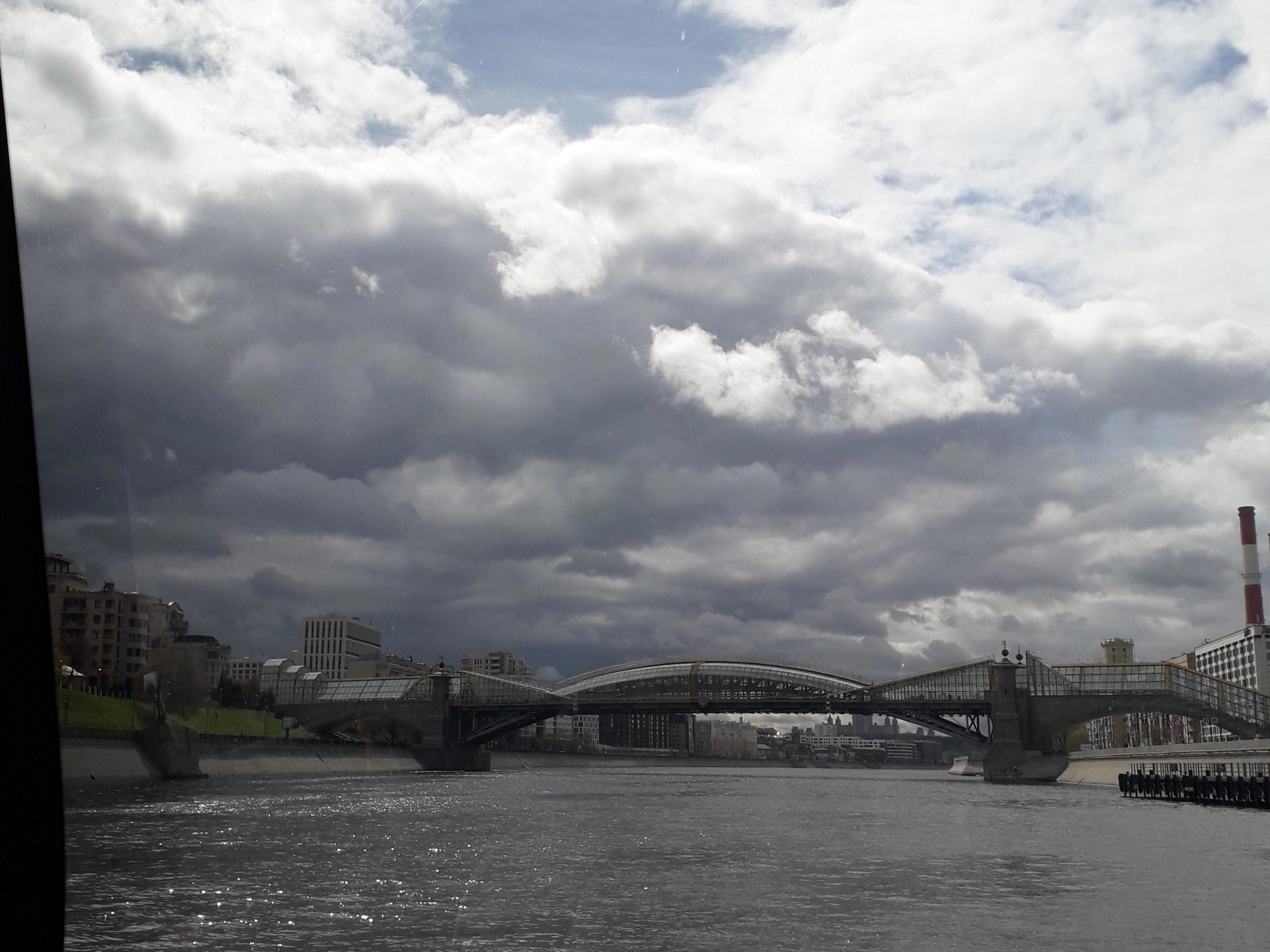 Итак, посадка завершена - отплываем от пристани. Очередной дождь только-только закончился - туча уползает куда-то в центр города. Мост у Киевского вокзала очень характерной конструкции - с другим не спутаешь.