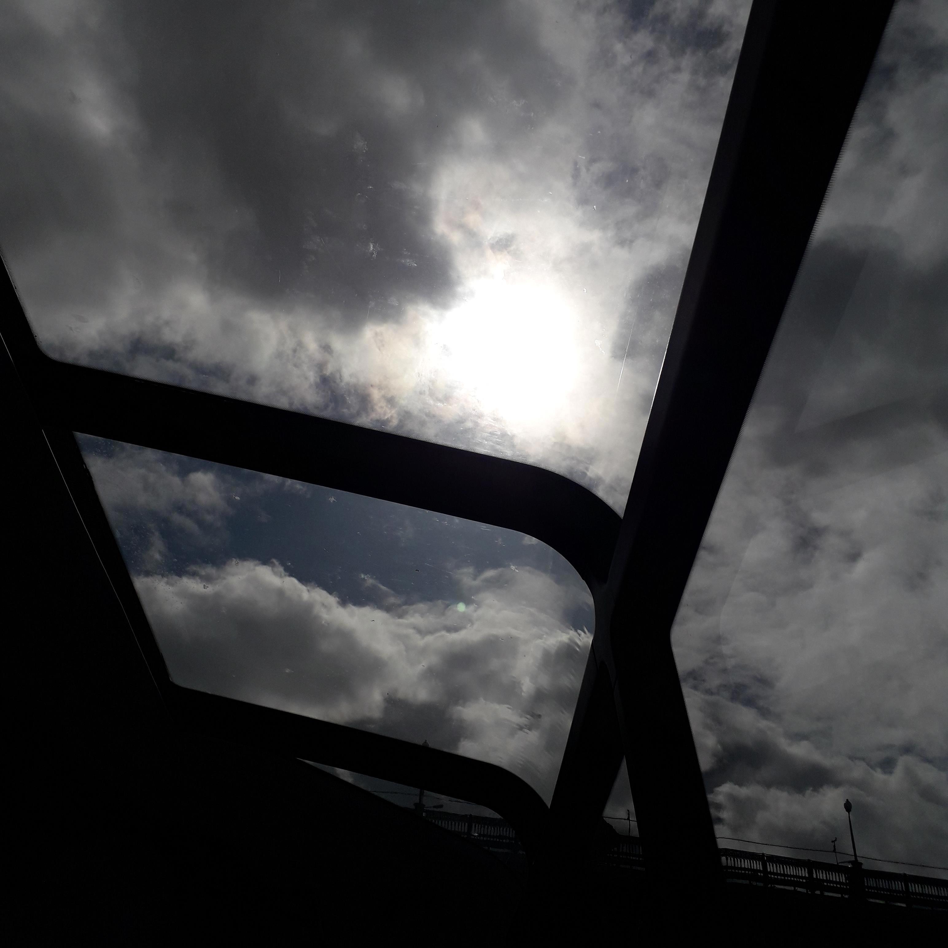 Потолок частично прозрачный (с затемненными стеклами), что удобно, когда проплываешь мимо высоких зданий или под мостами. Это я пыталась солнце сфотографировать, потому такое темное фото.