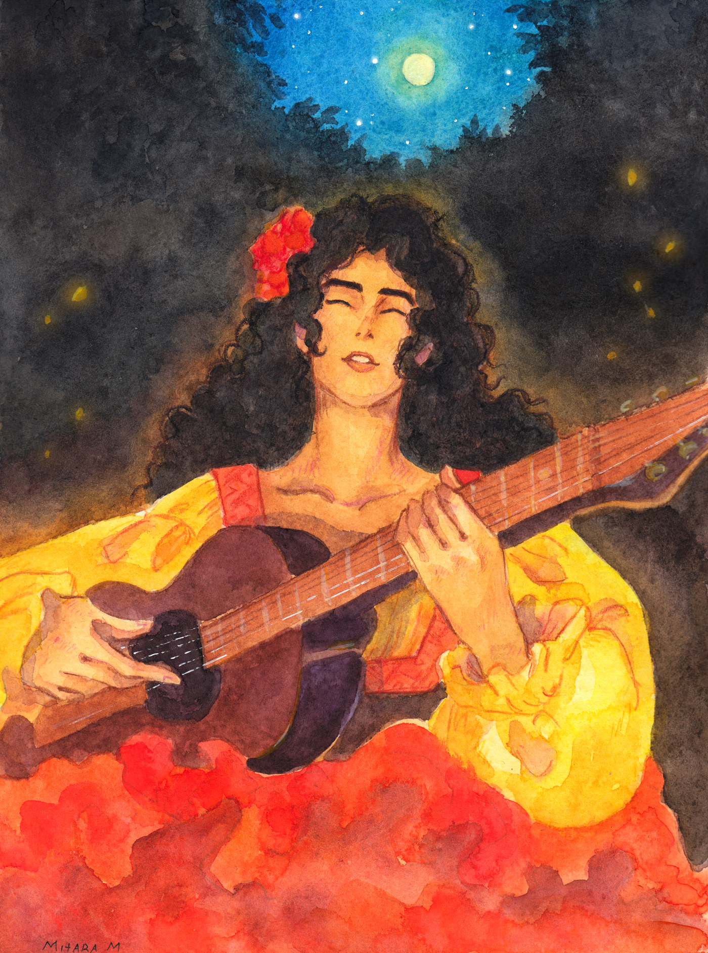 На площадку стали один за другим выходить другие юноши и девицы, вливались в танец, разбрызгивались на пары, менялись, отходили, пуская в круг кого-то, а то и двух. Уже невозможно было различить Хасинту среди мелькания юбок, а юбки — среди сполохов огня. Вспыхивали и звенели золотые серьги, и глаза сверкали не хуже драгоценных перстней в свете костров. Все перед Алисией слегка плыло, пальцы уже саднило, и только опыт строгих уроков позволил ей закончить, когда должно и как должно. Все вокруг зазвенело от голосов и смеха, и ее сердце бешено колотилось, заходясь от восторга. Никогда прежде, когда она играла в таборе или на площадях, когда ей бросали монеты и комплименты — никогда она не чувствовала подобного.