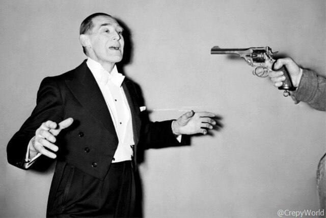 В конце своего шоу аргентинский фокусник Марво попросил своего ассистента выстрелить ему в голову из револьвера. Грохнул выстрел, и Марво, торжествуя, вытащил пулю изо рта (видимо он считал, что фокус, был рассчитан на детей дошкольного возраста).