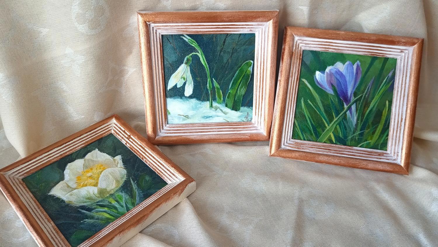 Автор: Надежда ЗуенкоЗакончила вчера маленькую (во всех смыслах - всего три штучки и размером 10*10см) серию весенних цветов акрилом на холсте. Решила заморочиться, даже рамочками озаботилась! :) Спецом купила деревянные рамки одинаковые, и покрасила белым и бронзовым.