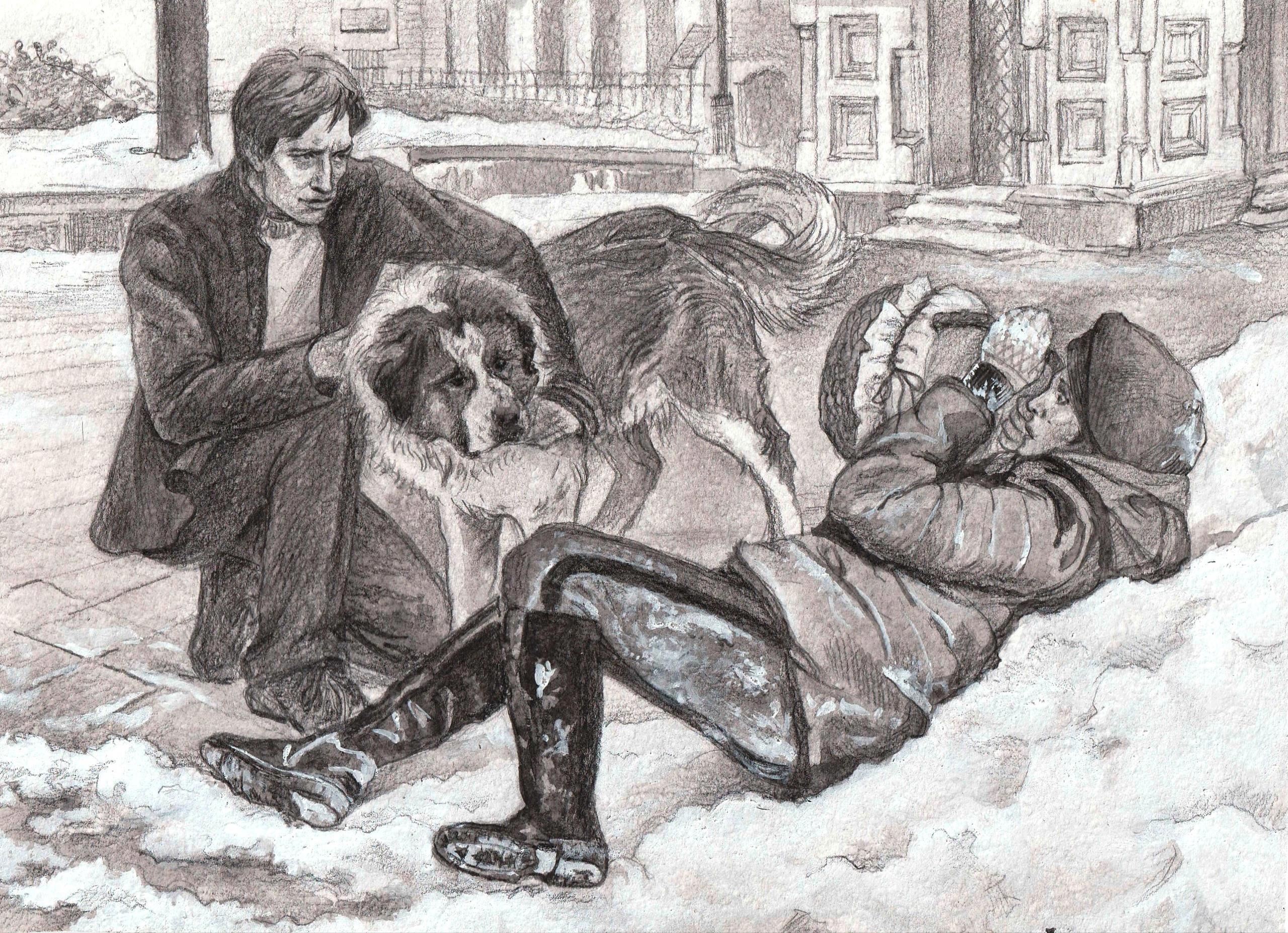 Причиной переполоха, по обыкновению, была Клякса. Она повалила в сугроб какую-то барышню и теперь норовила зализать её до смерти.
