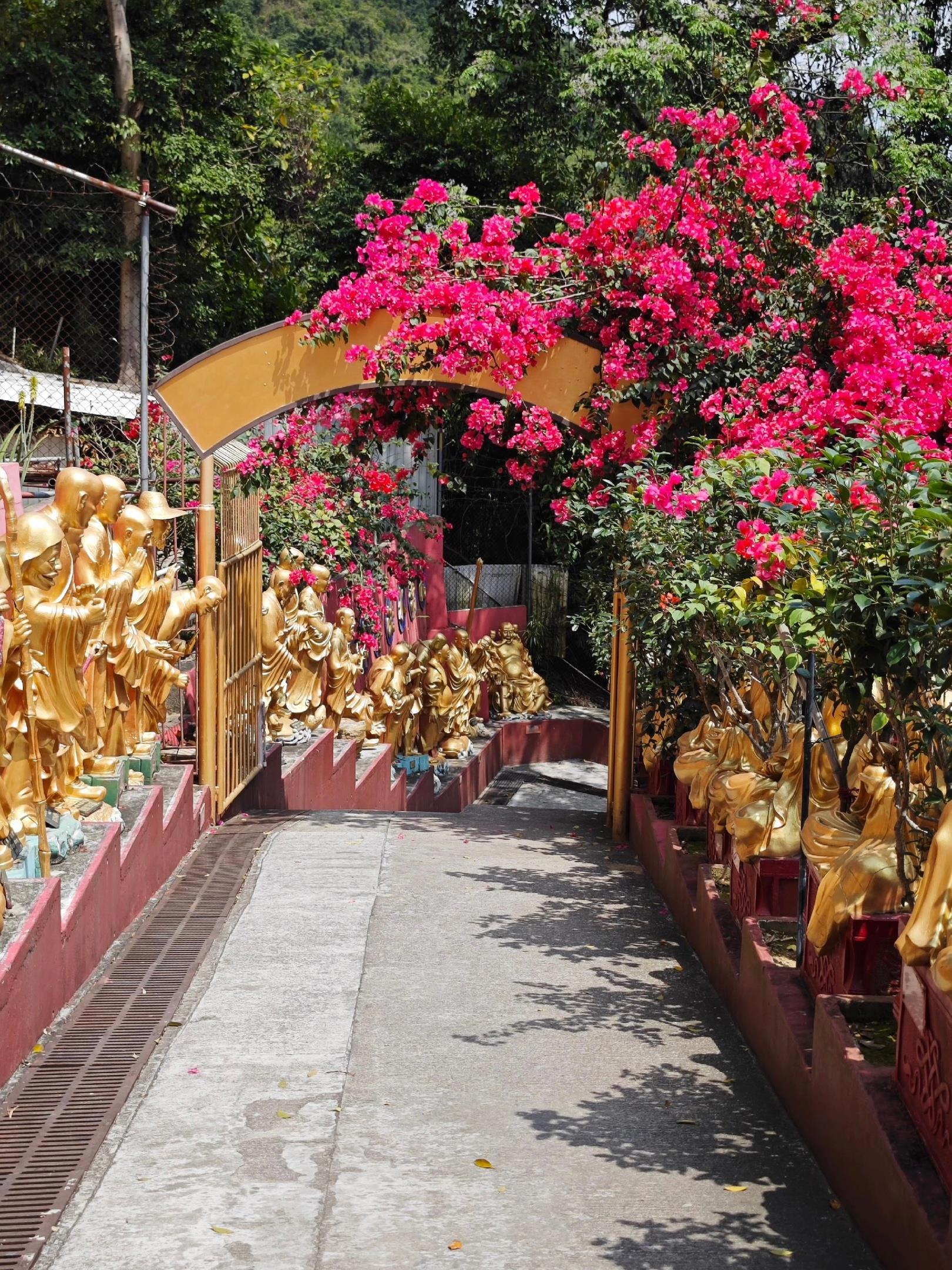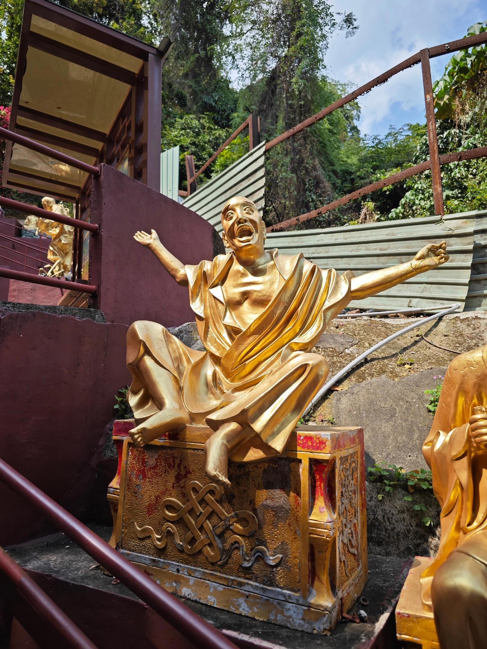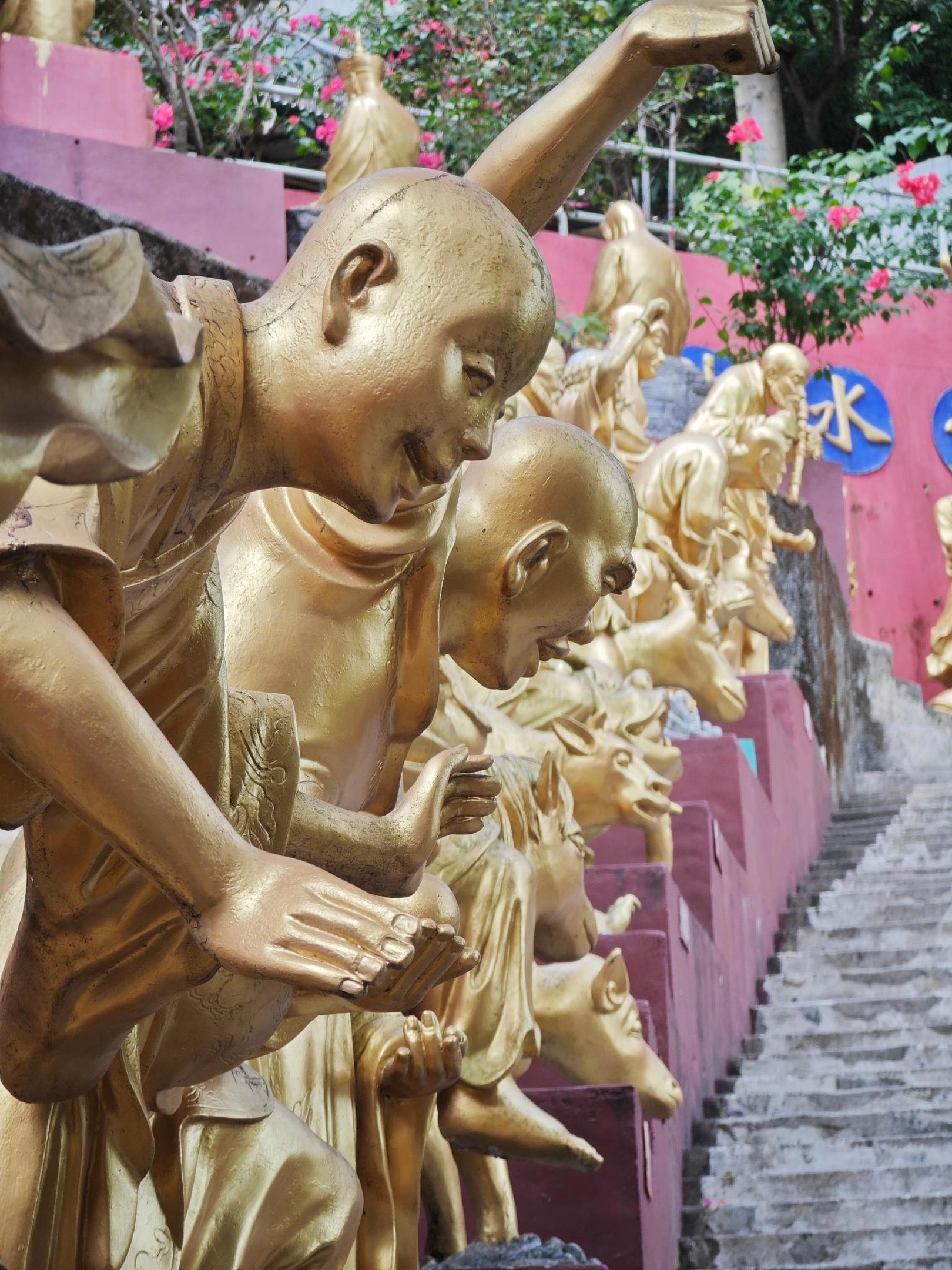 Большой буддийский храм со множеством статуй и длинной крутой лестницей.
