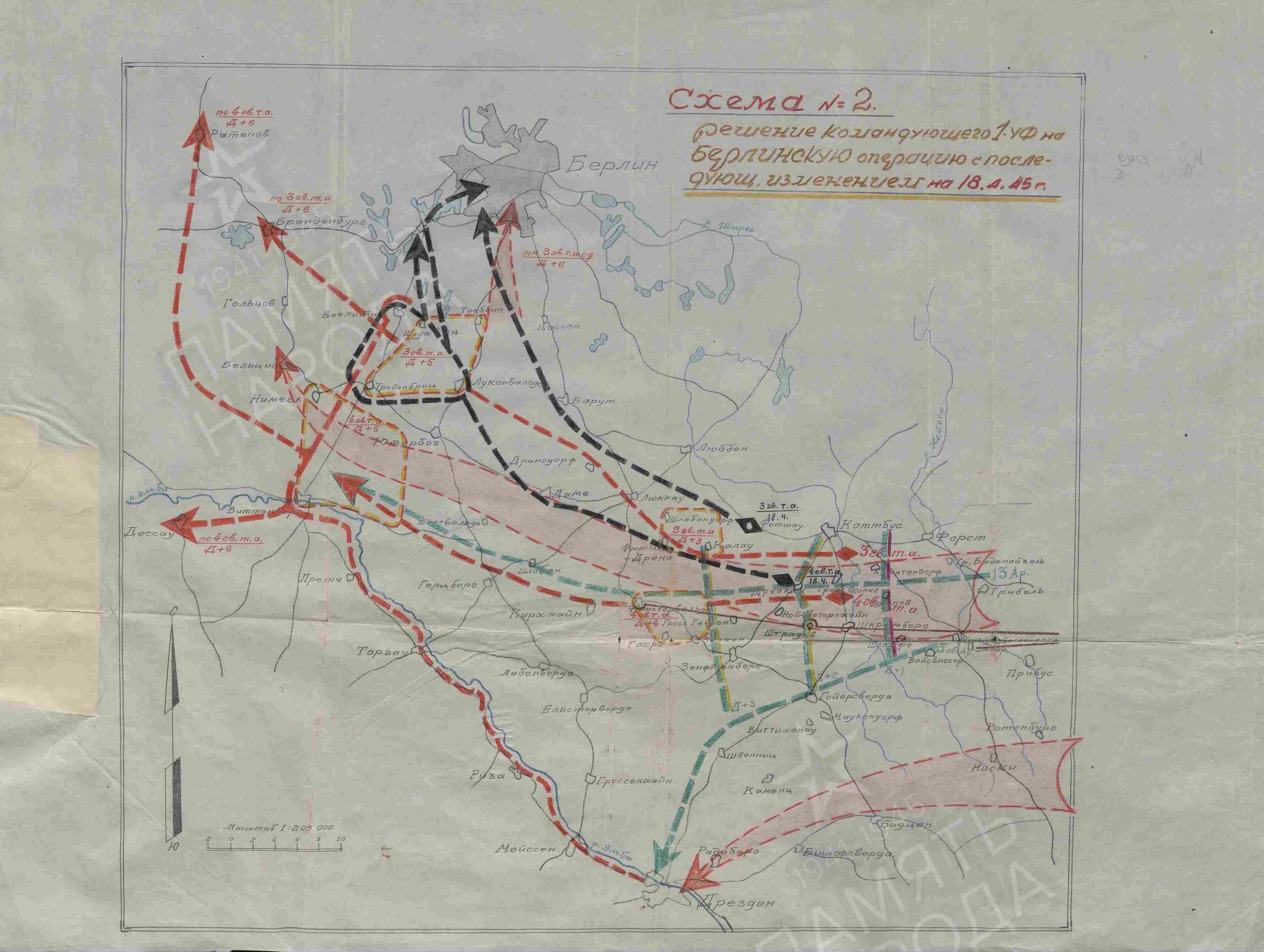 «Войска 1 украинского фронта наносят удар из района Трибель в направлении Шпремберг, Бельциг и из района западнее Кольфурт в направлении Бауцен, Дрезден с целью разгромить группировку противника в районе Котбур и южнее Берлин и не позднее 10-12 дня операции овладеть рубежом: Беелитц, Виттенберг и далее по р. Эльба до Дрезден. Иметь ввиду частью сил правого крыла фронта содействовать войскам 1 Белорусского фронта овладеть г. Берлин».