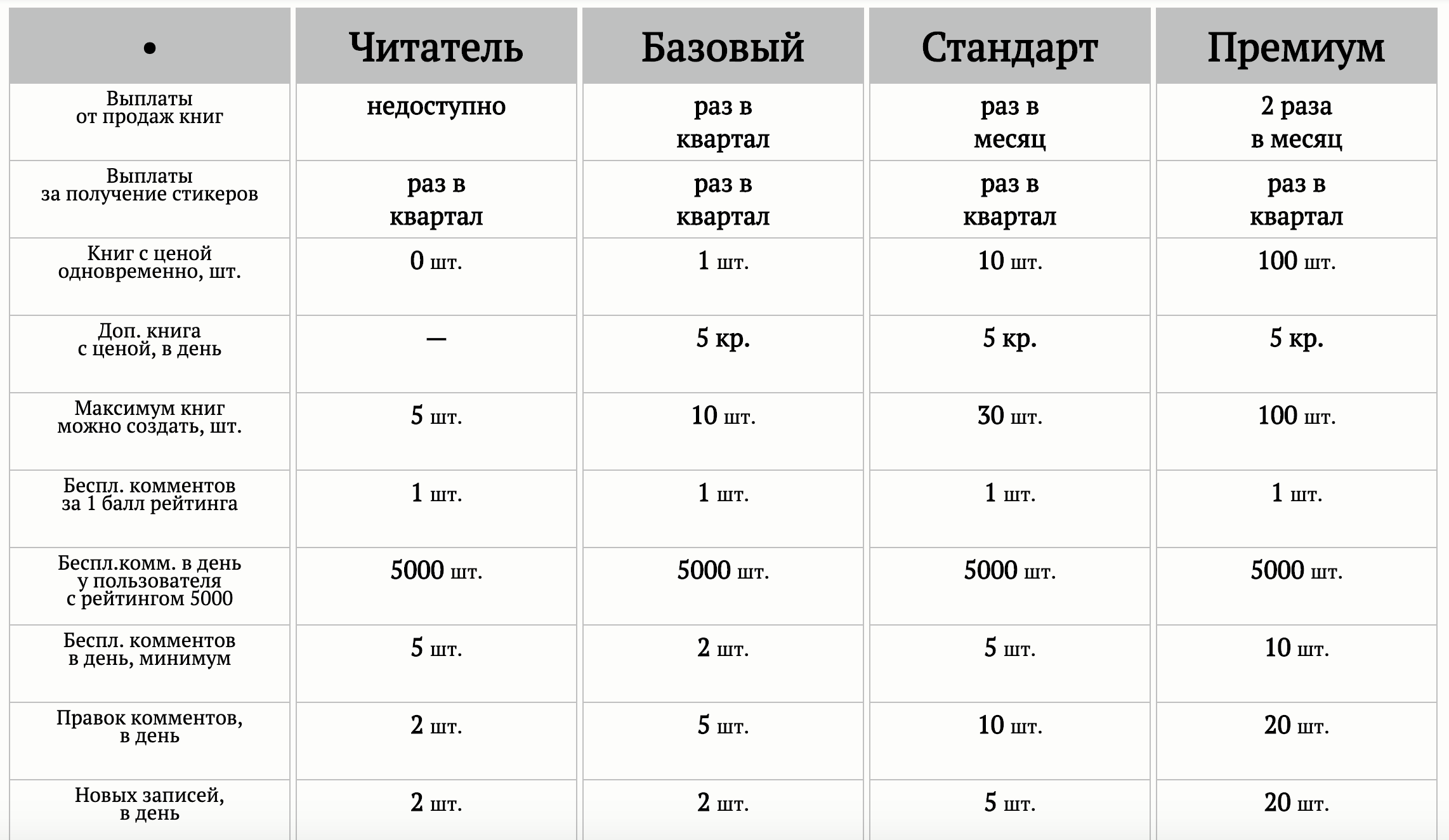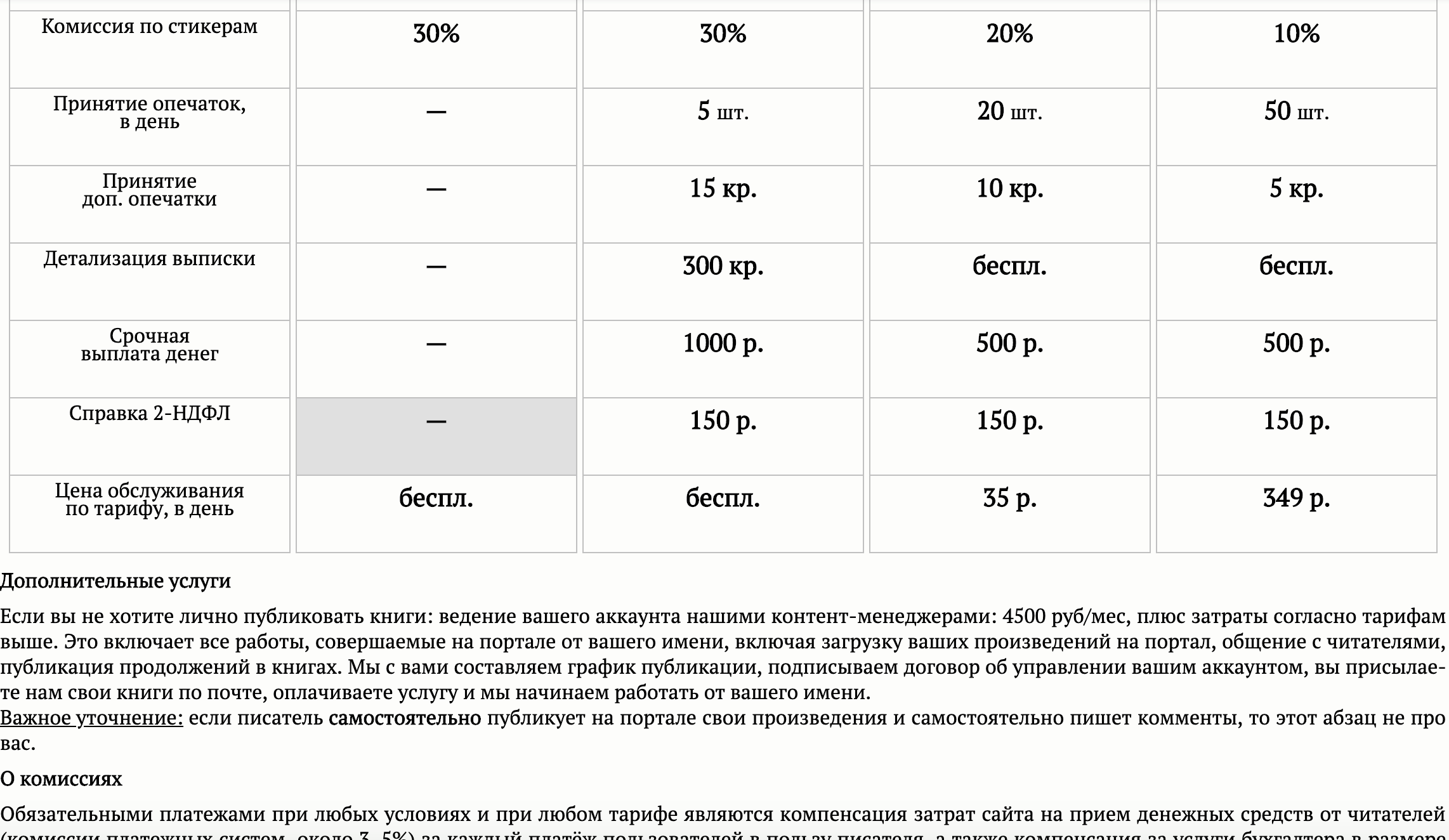 И вот тут стоит открыть страничку с тарифами для авторов. Да, да, вы не ослышались тарифы для авторов. За то, что писатель будет публиковать книгу он еще должен платить ресурсу некими виртуальными кредитами которые можно купить только за реальные деньги. Тут еще дизайн из начала нулевых, посещаемость в 50-100 человек в сутки.