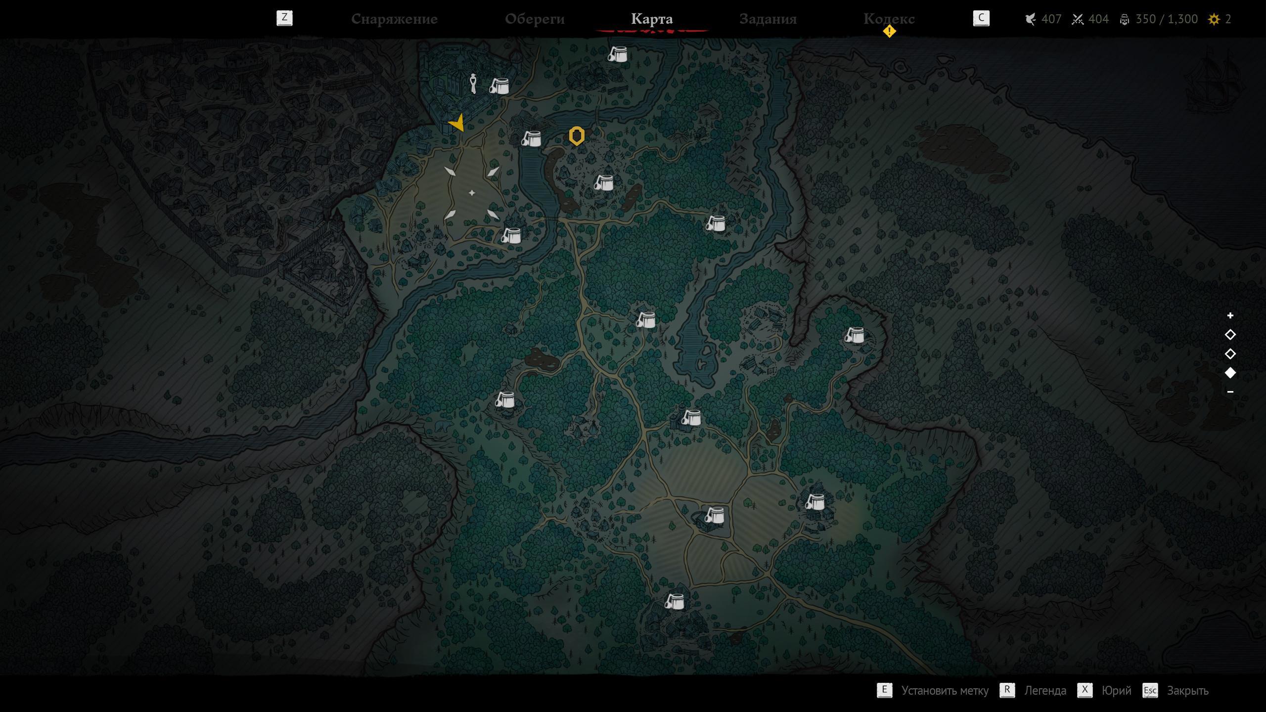 Кста-ати, а ещё у Юрия Батьковича имеется ведьмачье боярское чутьё, которое применяется в паре квестов. Нажимаем кнопку Q, мир теряет краски, зато подсвечивается всякое. С помощью этого инструмента можно также искать немногочисленные интерактивные объекты или не слишком приметные колодцы.