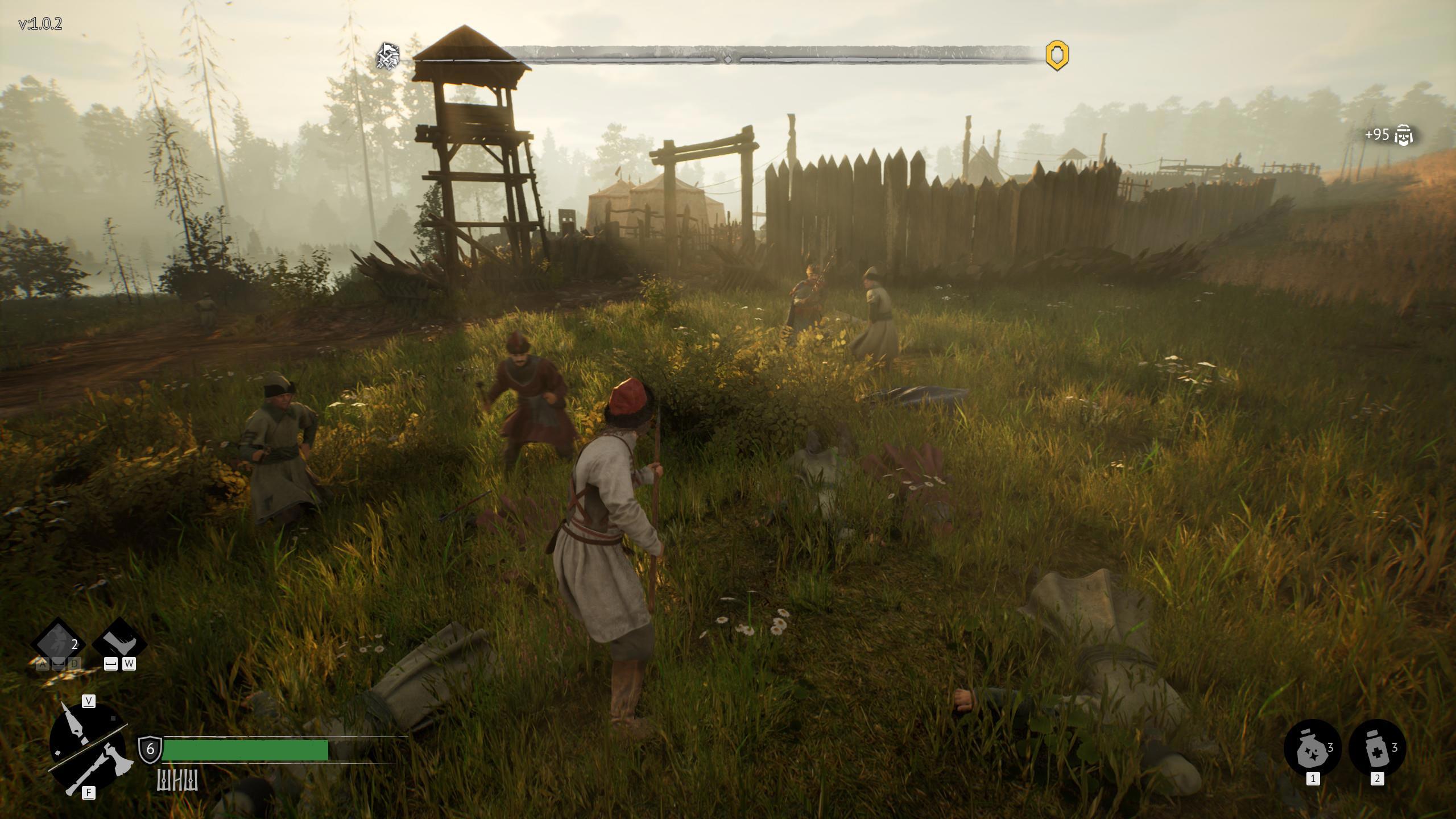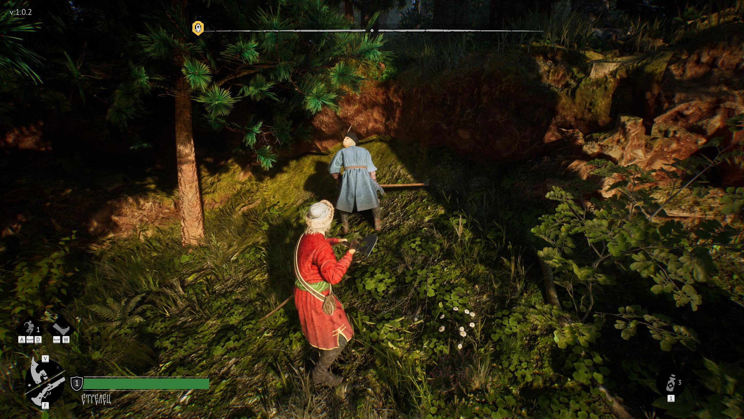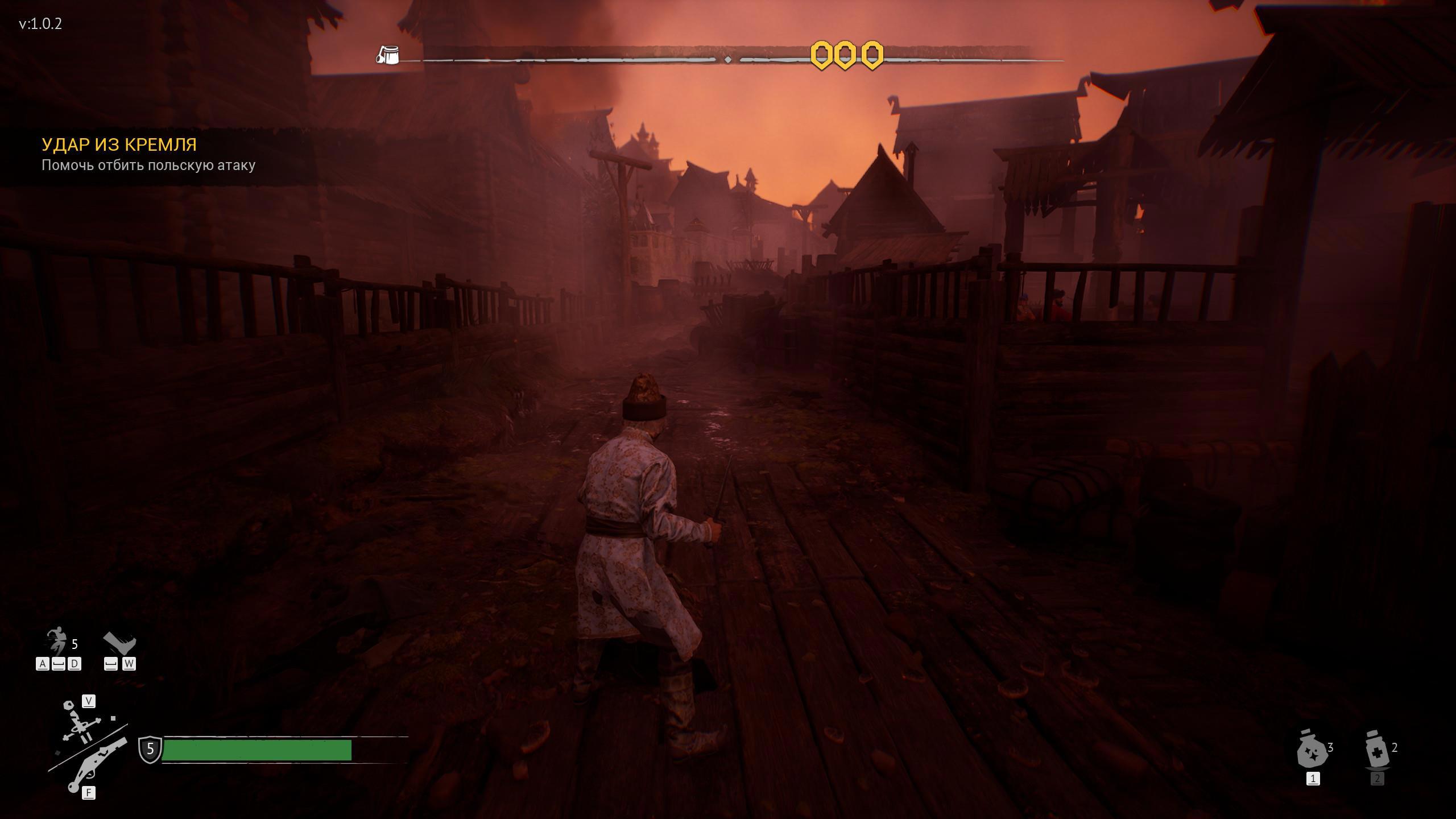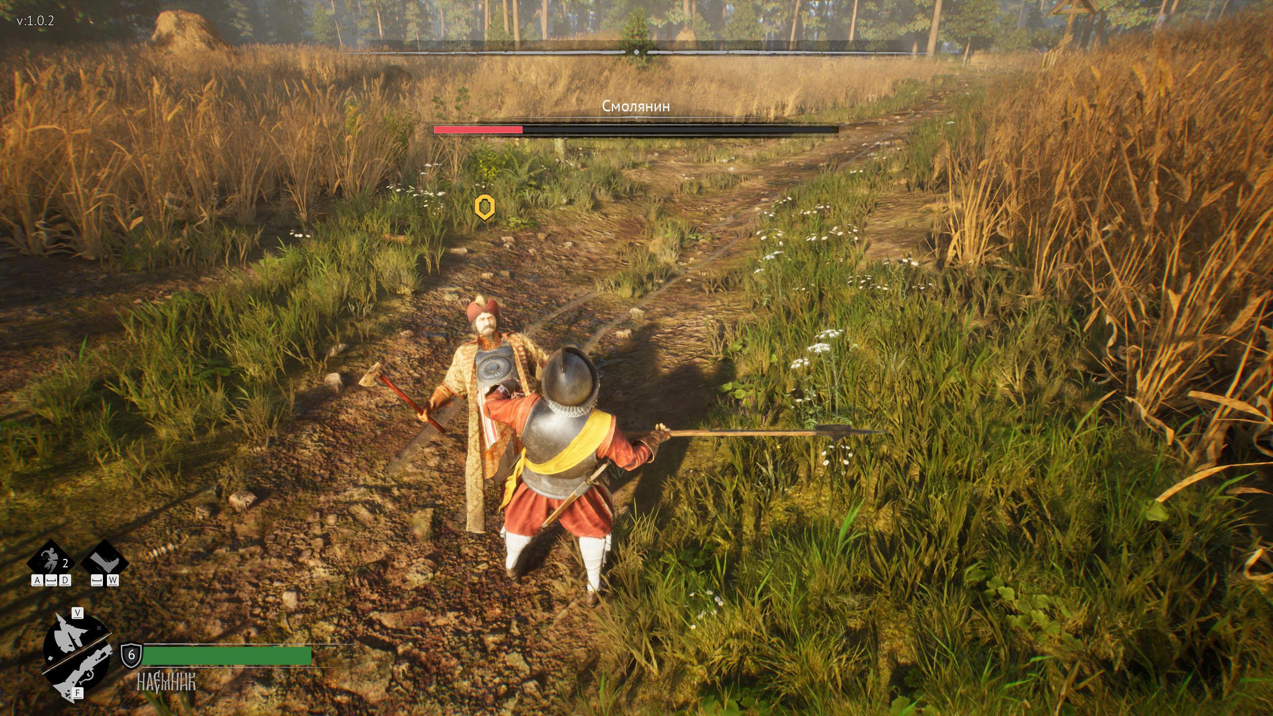 У нас есть основное и второстепенное холодное оружие, которые можно менять кнопкой V, есть огнестрельное оружие, использовав которое придётся ждать перезарядку (и вот мне очень интересно, какой именно частью тела Юрий перезаряжает мушкет), есть два слота под исторически достоверные зелья. Ну, вы знаете наших предков, которые навернут большую потку точности, чтобы не промахиваться из аркебузы, а если им саблей попадёт поперёк хлебала, тут же пьют зелье лечения, чтобы отрегенерировать, аки Росомаха.