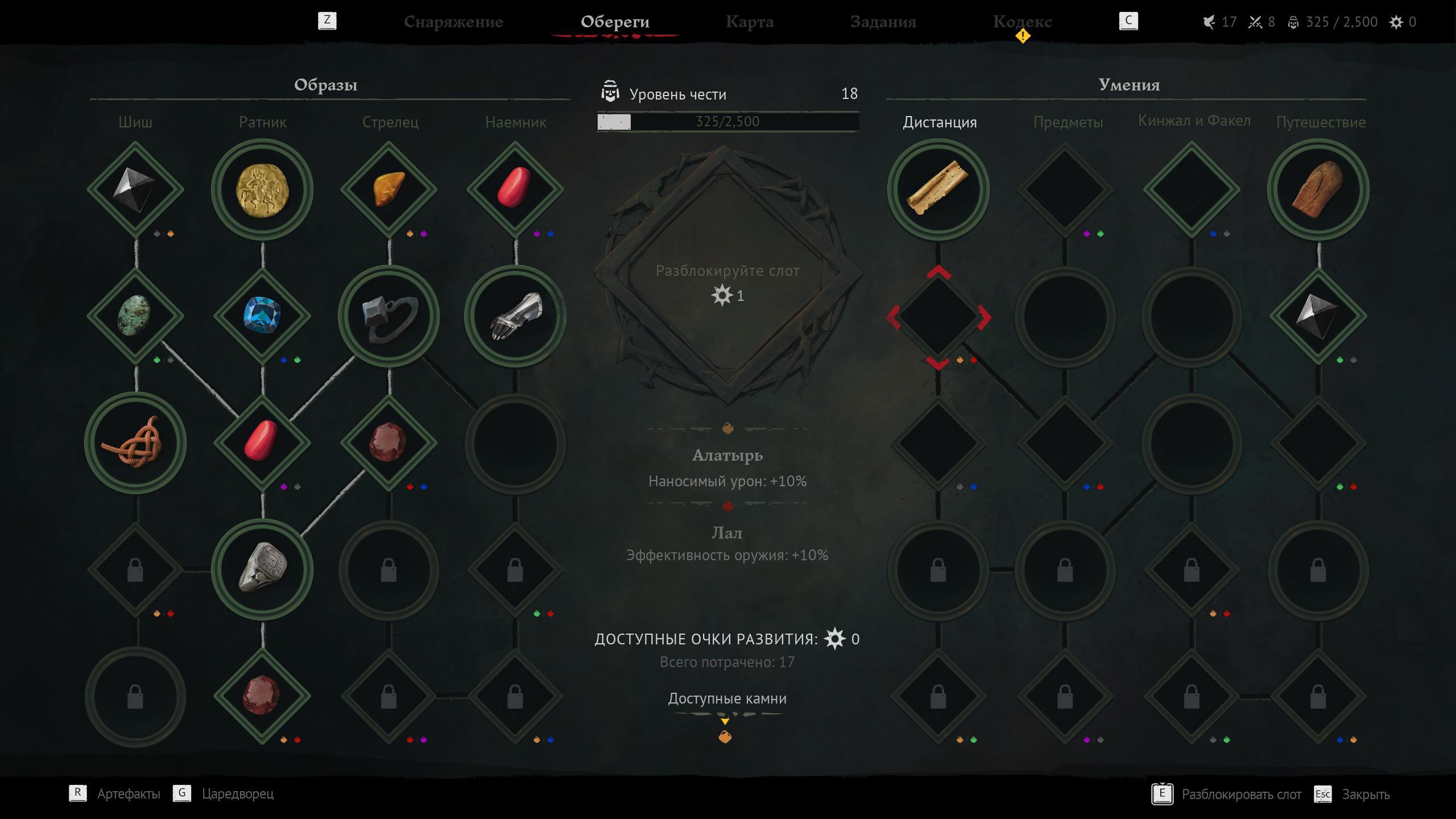 В них можно ставить вышеупомянутые артефакты, а также самоцветы. И то, и другое увеличивает наши характеристики в конкретном облике (донатный не в счёт, он уже как бы прокачан). Помимо этого, есть раздел «путешествия», который не привязан к облику, но качается по тем же правилам.