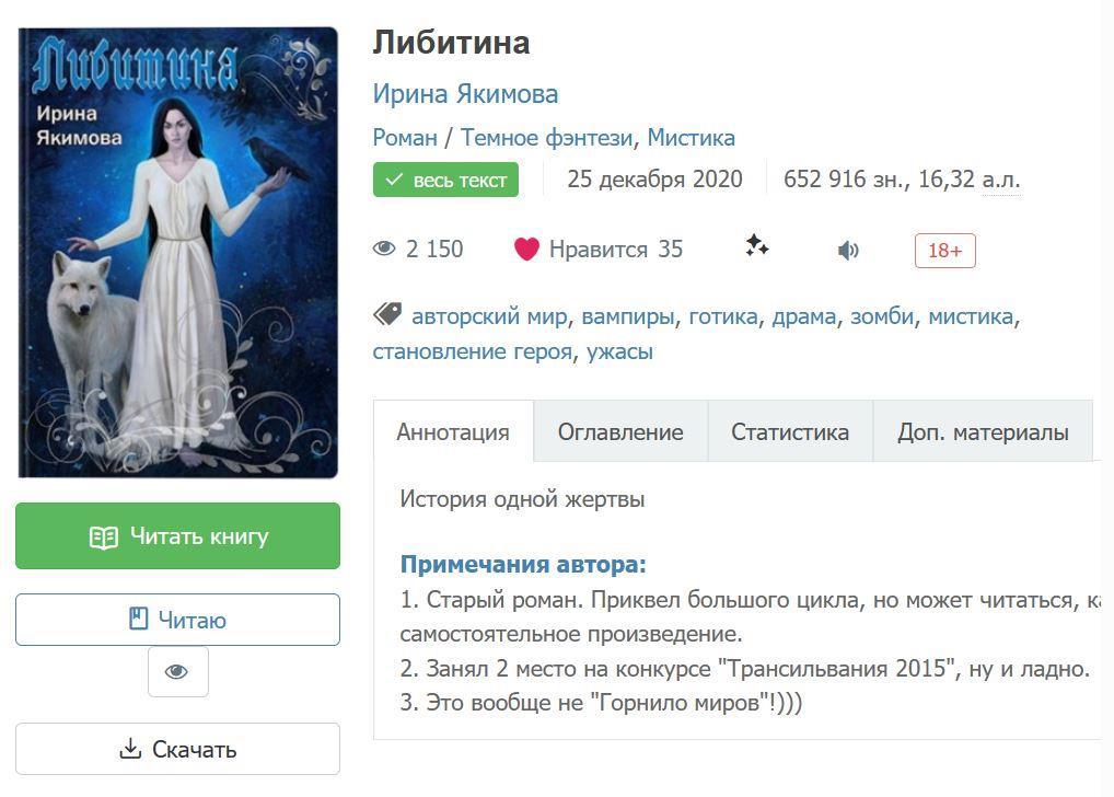 В итоге, я осилил пролог и кусок первой части. Да, не главы, как в книге, фактически нет. Всего размером в 16 алок книга состоит из 9 элементов, 5 из них условно маленькие, зато остальные четыре... Около трёх алок, т.е. размером с маленькую повесть. И главное, делится оно на главы очень легко. Например вполне можно сделать разбивку в месте, когда Ариста (так зовут главную героиню, точнее звали, до того, как она стала Либитиной) с мужем едут в свою южную резиденцию. Но нет, читатель должен страдать, пролистывая полотно текста, чтоб найти момент, на котором он остановился, если сайт почему-то решил это место не запоминать.