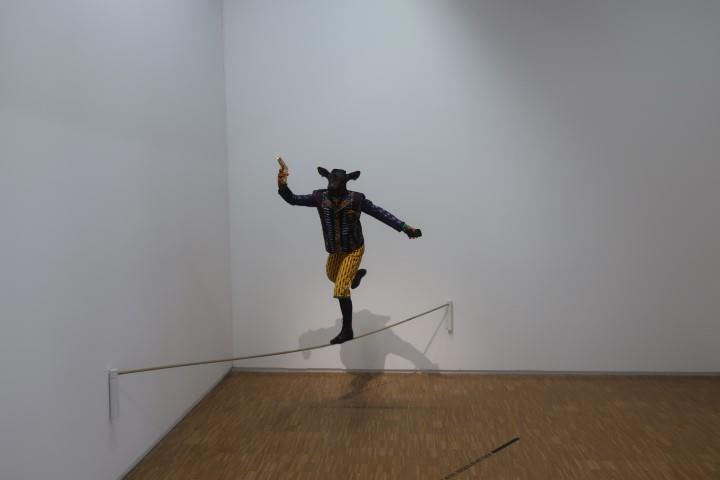 Видно, это аллегория политика с головой зверя, балансирующего между войной и переговорами в шатком равновесии.