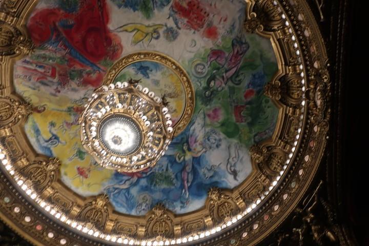В прежние времена зал освещался свечами, и самые дорогие сейчас места под люстрой считались самыми дешёвыми и плохими - воск капал на головы. Кроме того, свечи коптили и испортили изображение над люстрой. Что бы вы думали? У кого-то возникла идея пригласить Марка Шагала, который расписал это место в своём стиле, но совершенно несоответствующим остальному убранству. В это время Шагал был уже в возрасте, и, конечно, не залезал под потолок на стремянки, как работал Микеланджело и другие живописцы, а рисовал в своей мастерской в течение года. Роспись вызвала огромный скандал в обществе, что, как ни странно, увеличило количество посещающих.