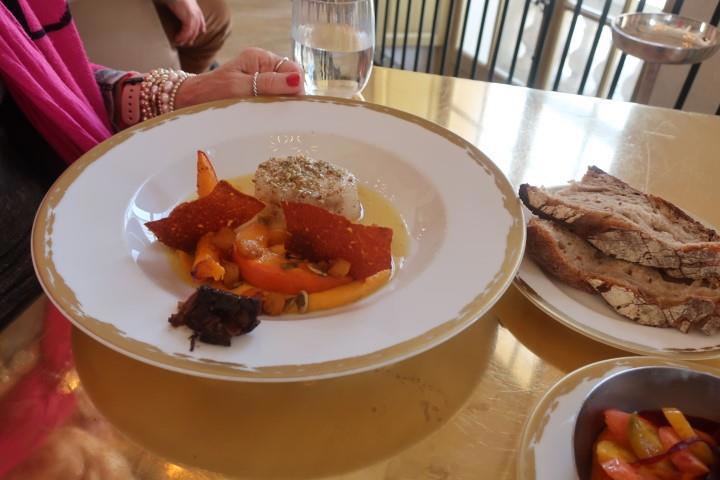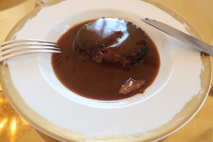 Тут же кафе и ресторан. Обедать в версальском ресторане - не самая лучшая идея, ну мы уж очень проголодались после прогулки по садам. Блюда необычные и недешёвые. Почему-то жена всегда удачнее заказывает блюда - она заказала Фуа гра - гусиную печёнку с маринованными апельсинами, а я ел странное сочное мясо в каком-то загадочном чёрном соусе. Дополнительным удовольствием явилось то, что после еды нас провели в Версальский дворец без очереди через какую-то секретную дверь.