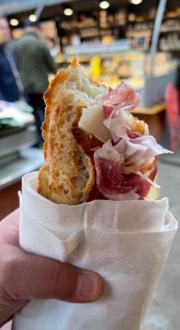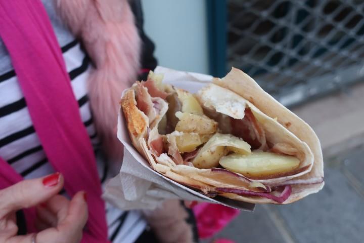 Там и обжаренная варёная картошка, и окорок копчёный, и сыр нескольких сортов, и сливки (?), и ещё бог знает что. Не дошли до парковой скамейки, как планировали - съели всё на ходу.