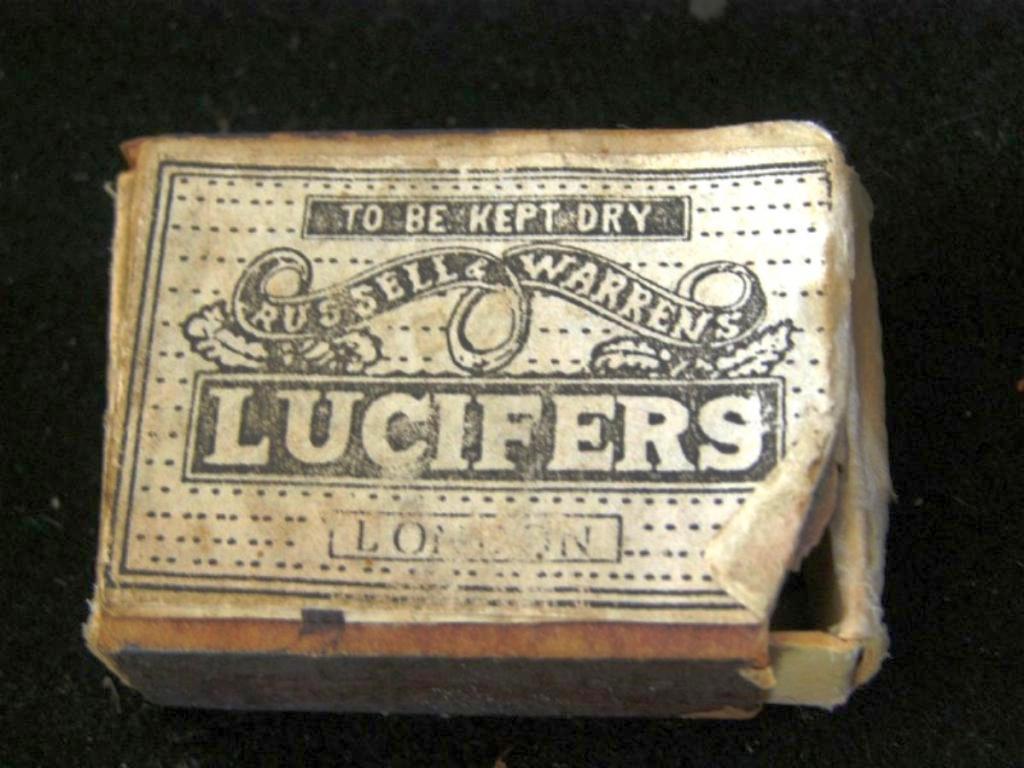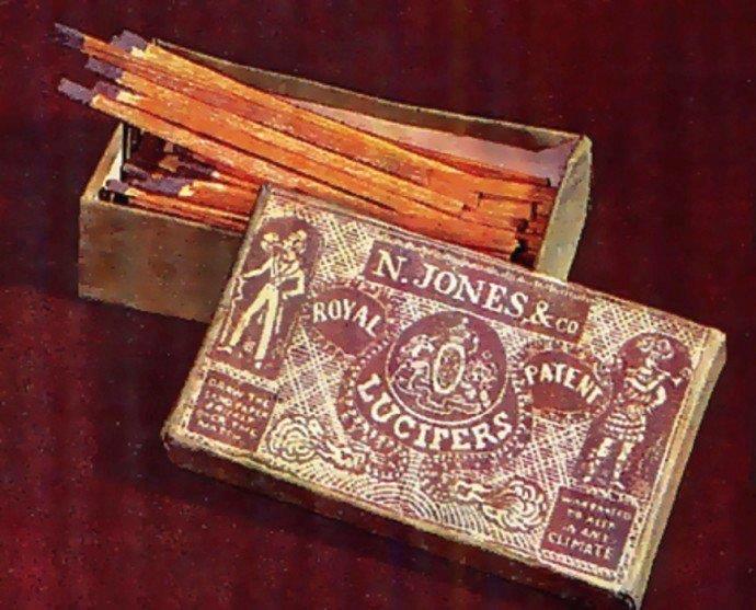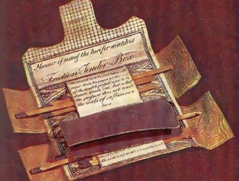 Дальше история немного разбредается, что, в общем-то нормально. Так часто бывало в истории техники – как говориться «идея витала в воздухе». Мнений много, однако большинство всё же отдаёт первенство английскому аптекарю Джону Уокеру, который в 1827 году (в 1824 по другой версии) как-то перемешивал палочкой химикаты. На конце образовалась и засохла капелька, которую Джон хотел просто вытереть, потерев обо что-то твёрдое и шершавое… вспыхнуло пламя. Это и было настоящее начало… или не это. Ведь по другой версии примерно то же самое произошло во Франции. Неважно. Дальнейшая история тоже была поучительной. Изобретатель изготовил некоторое количество своих спичек (первых – картонных), которые он назвал «Congreves» и 7 апреля 1827 года в городке Хиксо состоялась их первая продажа. Сами спички были изготовлены из картона. Говорят, что вот это они и есть, но может и не они, но всё равно – из первых: