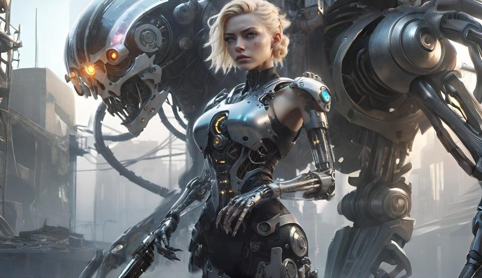 А вот - посерьёзнее: иллюстрация к несуществующему фантастическому боевику, про воюющих в космосе биомеханических дев и их боевых роботов: