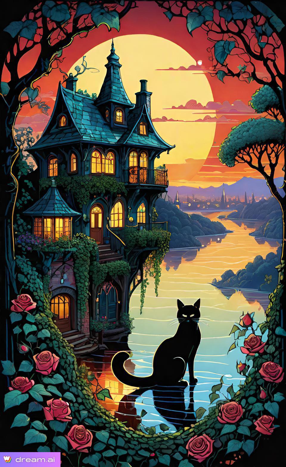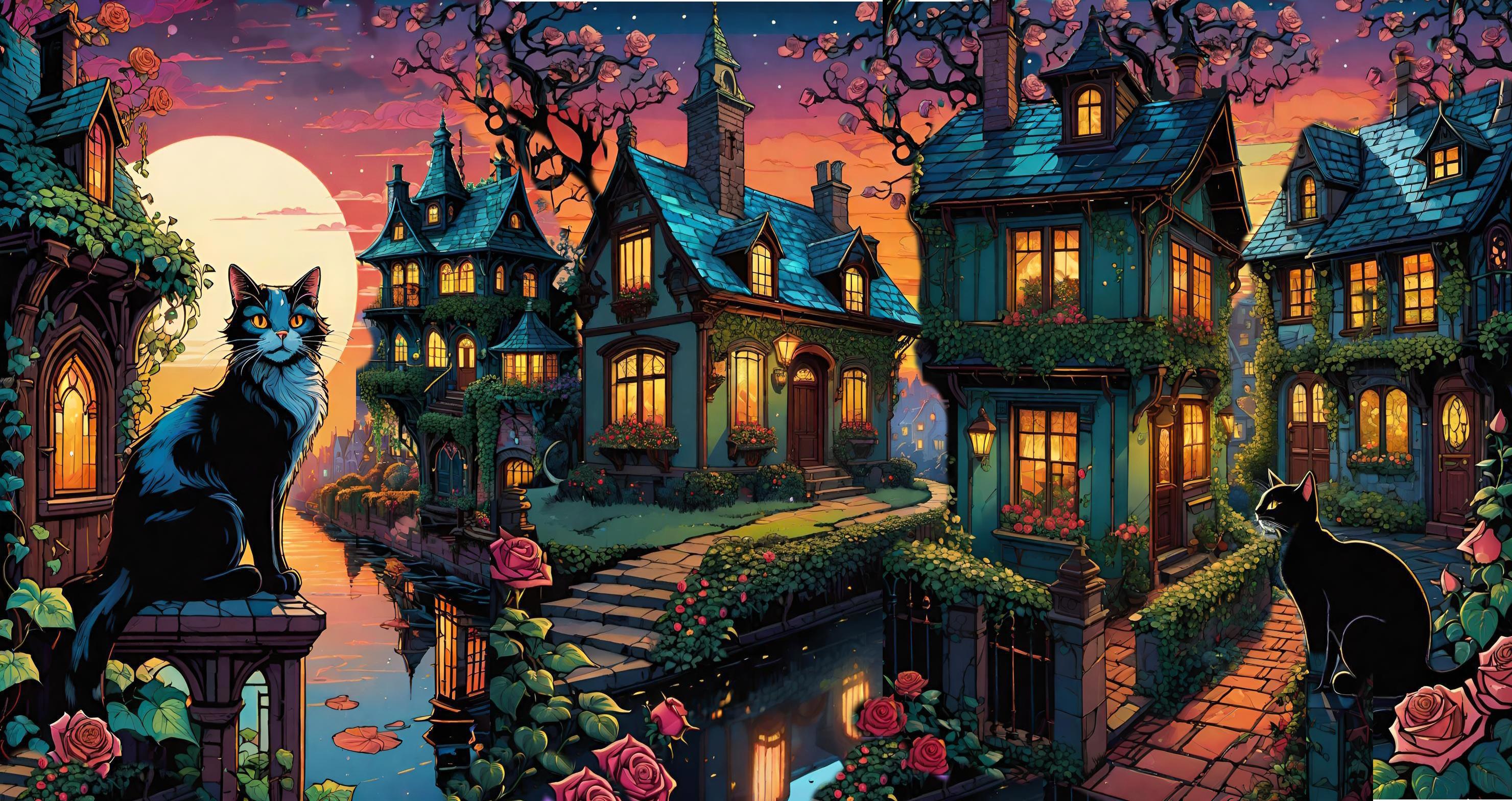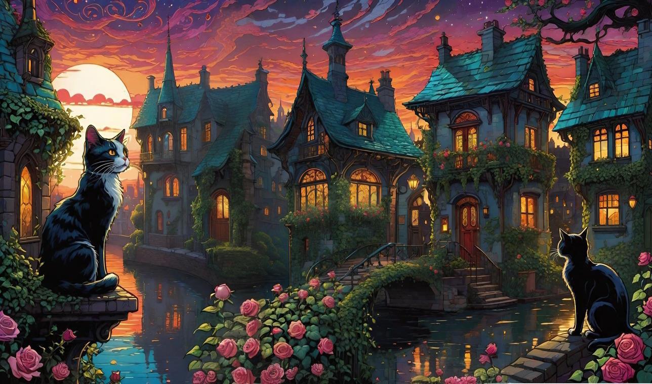 Вот, например. Вам нужно изобразить сказочный город над водой и котиков, которые живут в этом городе. И вы в промте приблизительно так и пишете: amazing, fabulous, cozy city, cute houses covered with ivy, blooming roses, cute cats everywhere, cold evening, sunset, Rodney Matthews style, Bilibin style, stained glass, very clear fancy details
