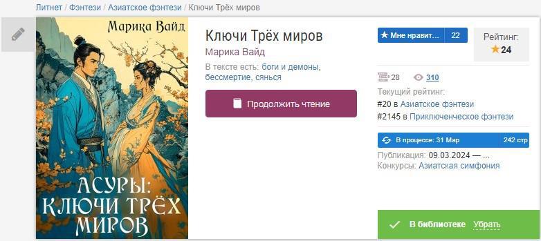 На Литнет закинула несколько первично вычитанных глав. Всего в открытом доступе 49 глав (+7 за неделю).
