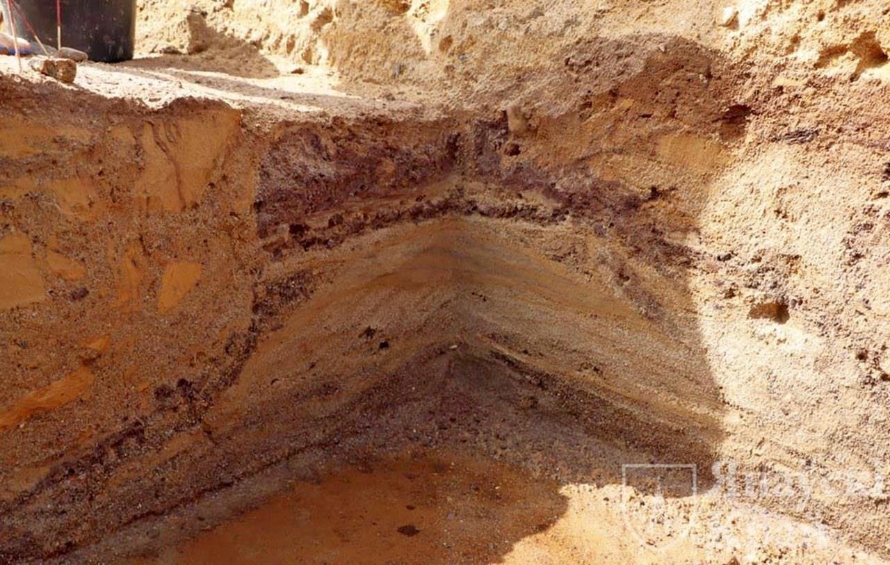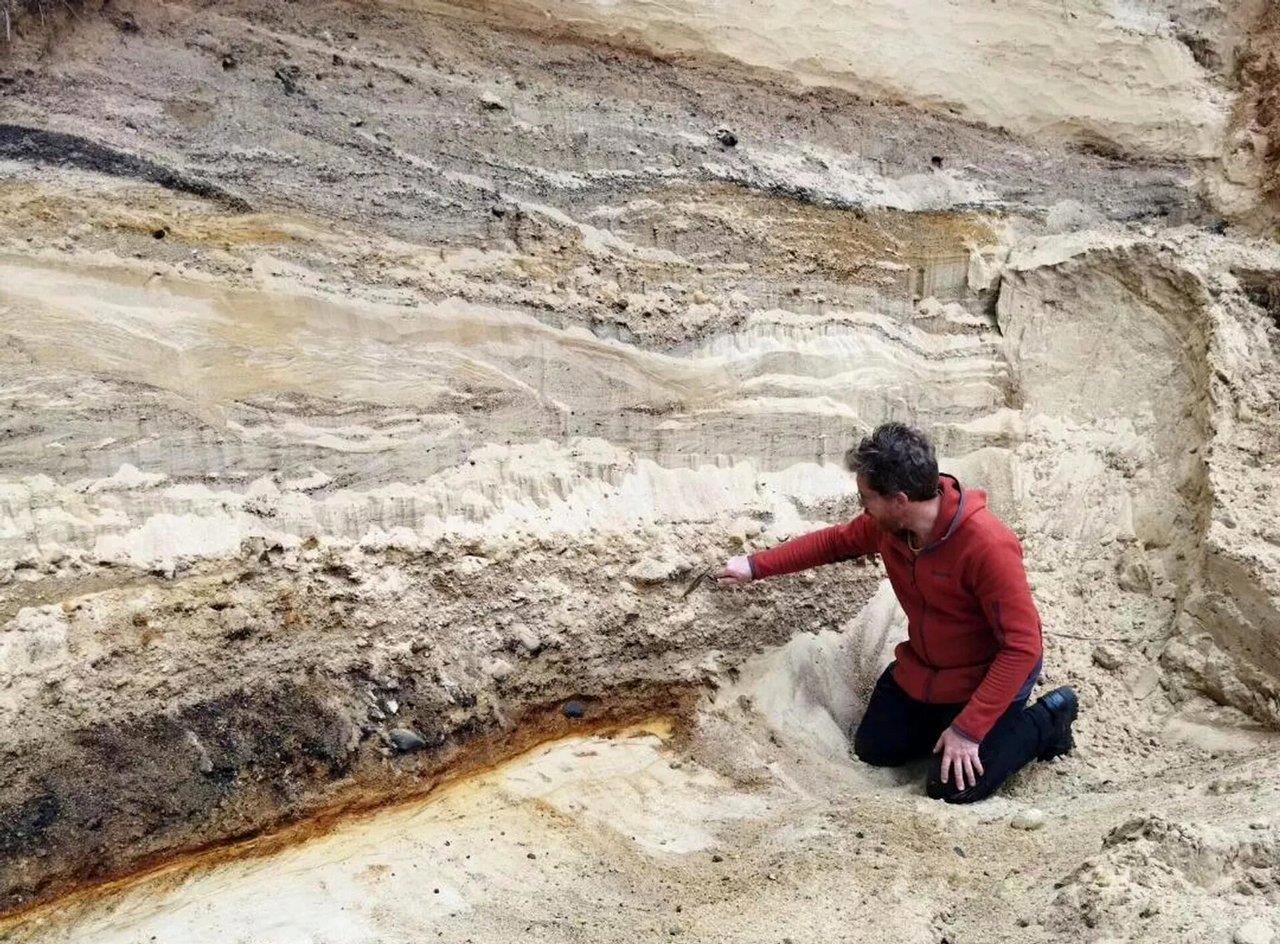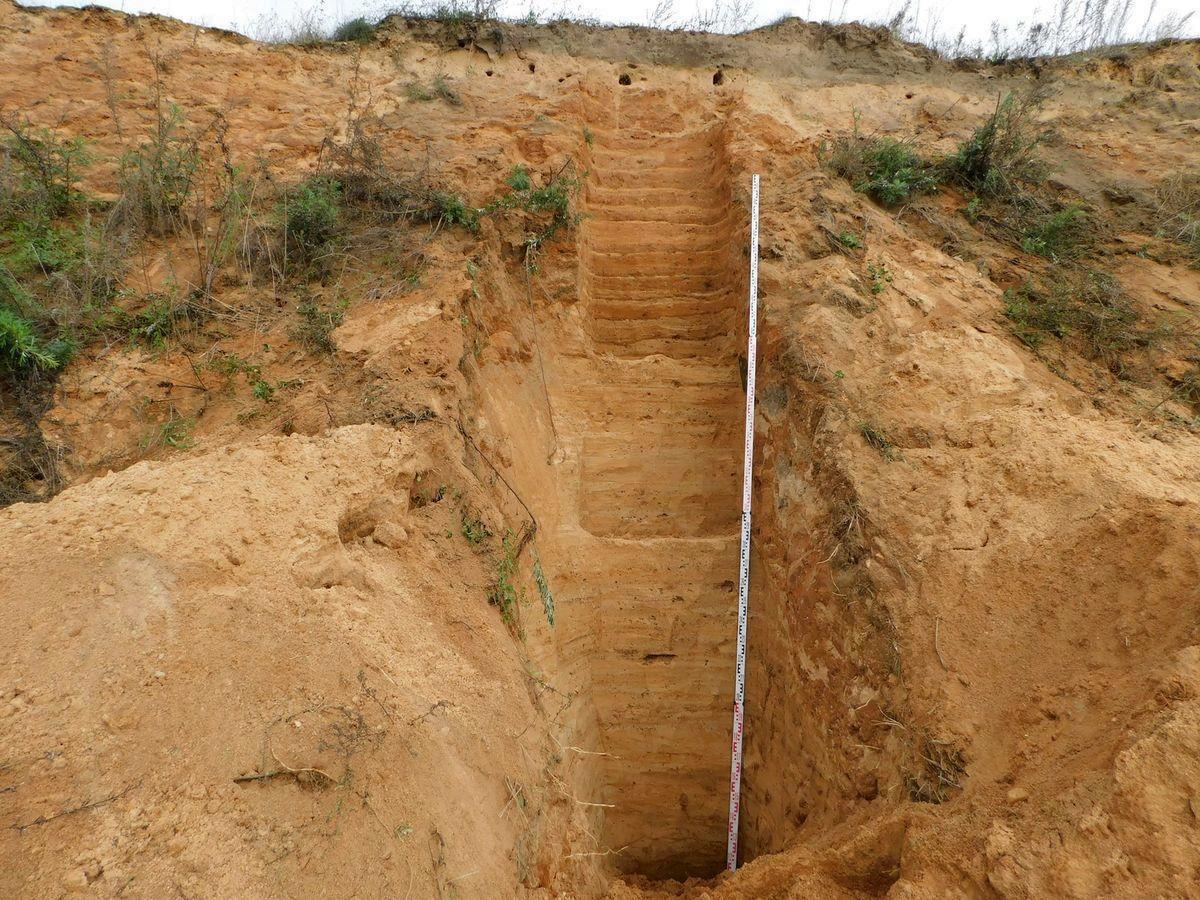 Тогда провели небольшую предварительную же работу. Эвон сколько интересных разноцветных слоёв песка и не песка оставило нам Время. Опытный взгляд пытается прочитать, что же здесь «написано». Вид у него очень серьёзный… может на самом деле что-то понимает?