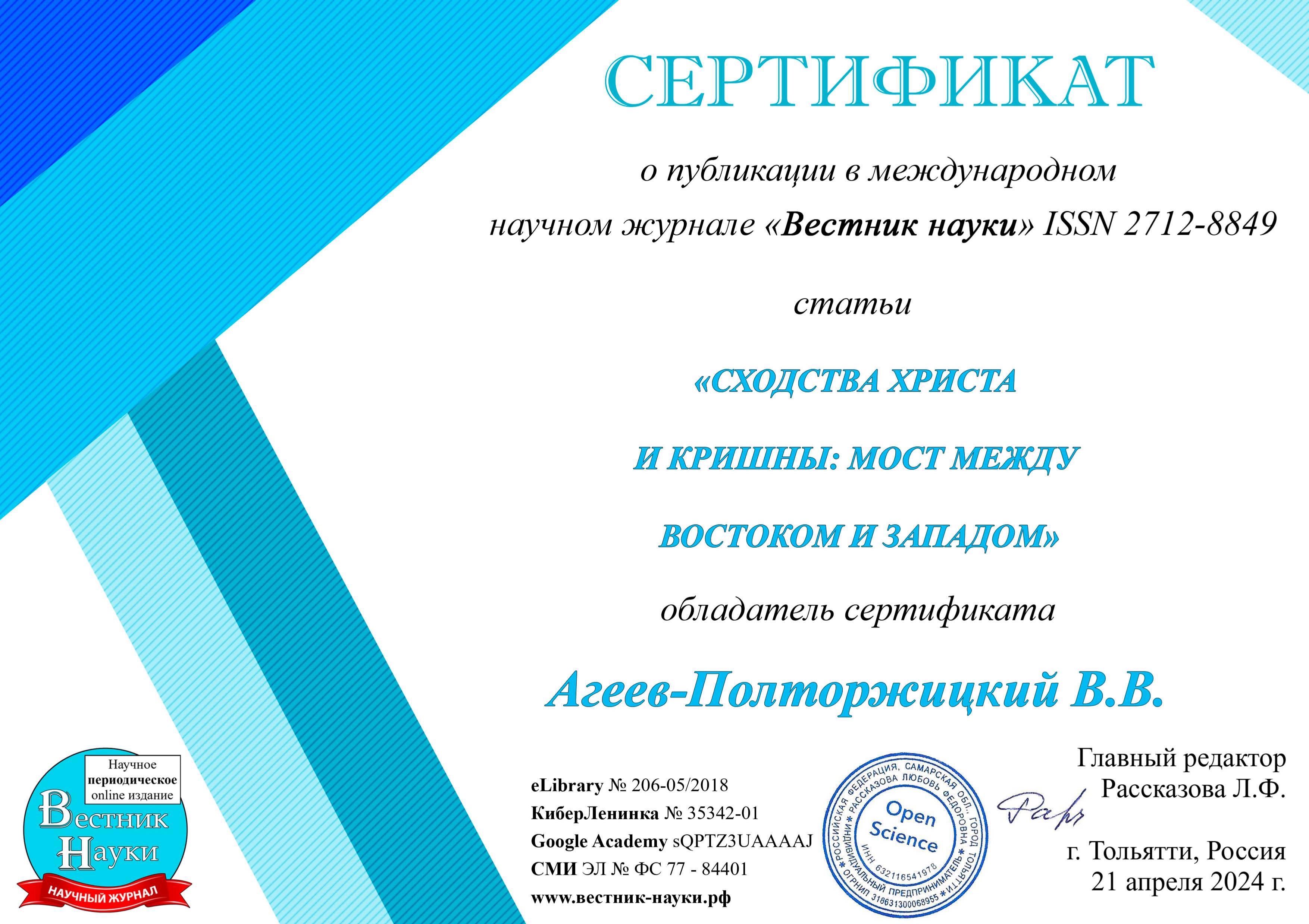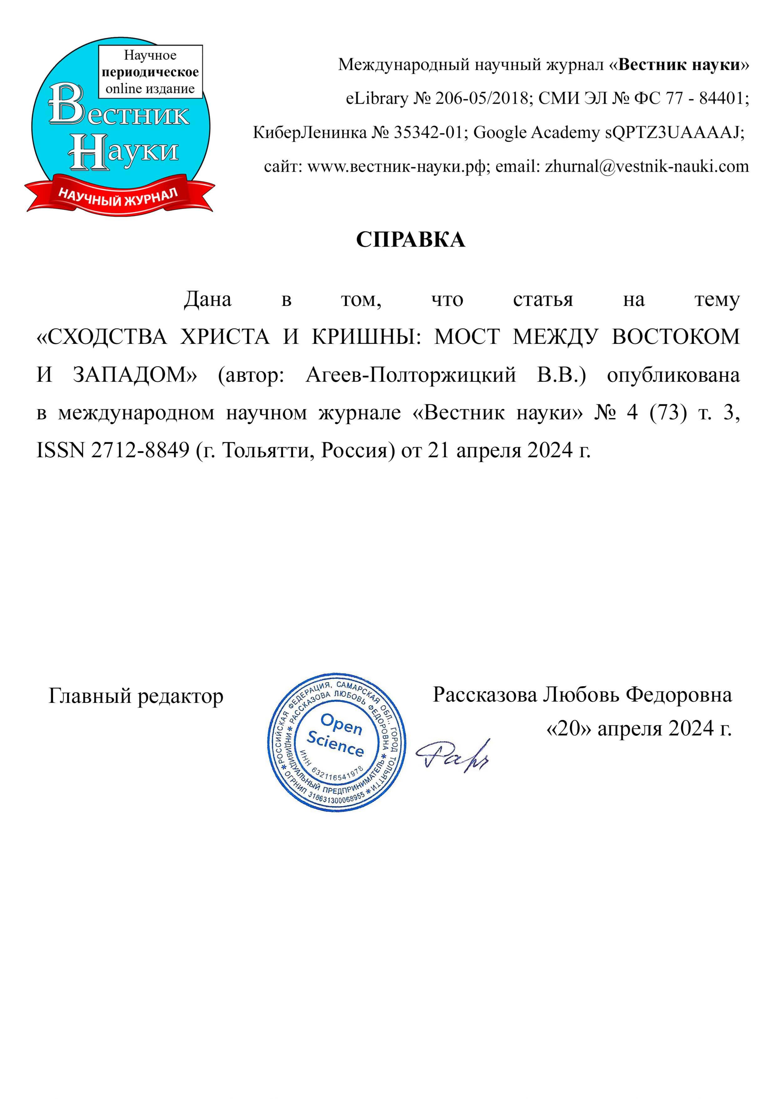 Автор: Виктор Агеев-ПолторжицкийДрузья, сегодня я хочу поделиться с вами чудесной новостью, которая стала для меня большим шагом в мире научных исследований. Моя статья под названием "Сходства Христа и Кришны: мост между Востоком и Западом" была принята к публикации в авторитетном журнале "Вестник Науки" и выйдет уже завтра!