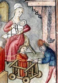 Впервые? Видимо, авторы статей хотели сказать, что это первое изображение ходунков на картине, так как в книжных миниатюрах их изображались и раньше, в том числе и более сложные, наподобие этих (одно из самых известных изображений ходунков "Четыре возраста человека").