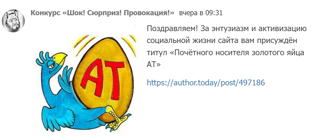 Автор: ПчёлкаДобрый день, всем жителям портала АТ. Сутки решала — похвастаться или нет. Все же решилась и хвастаюсь, что за ведение игры-марафона «Читатель-автор» Пчёлка получила титул «Почётного носителя золотого яйца АТ».