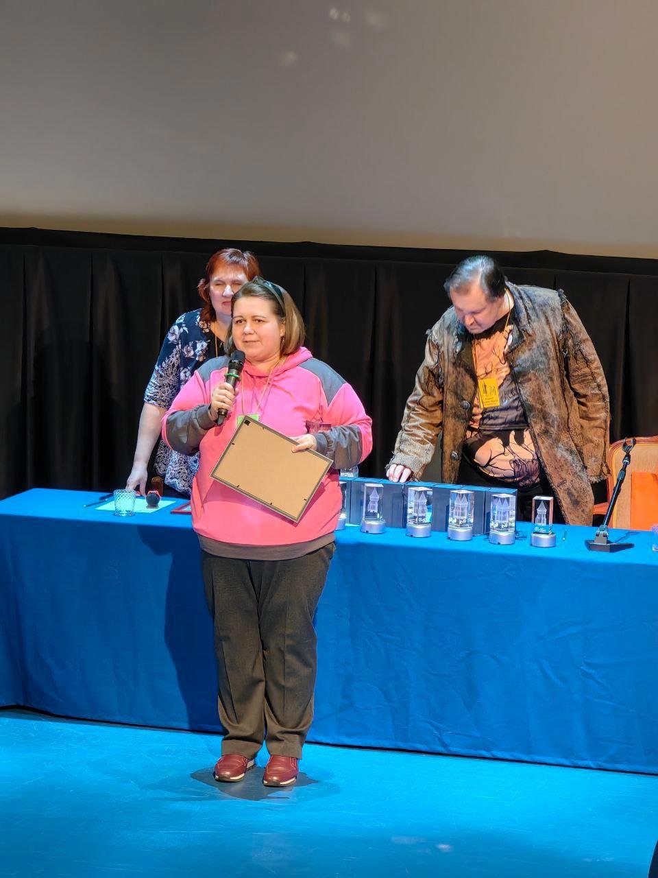 Девушке Ире выдаю награду «Хрустальный голос Роскона» и благодарю за «Под небом голубым» и Мельницу.