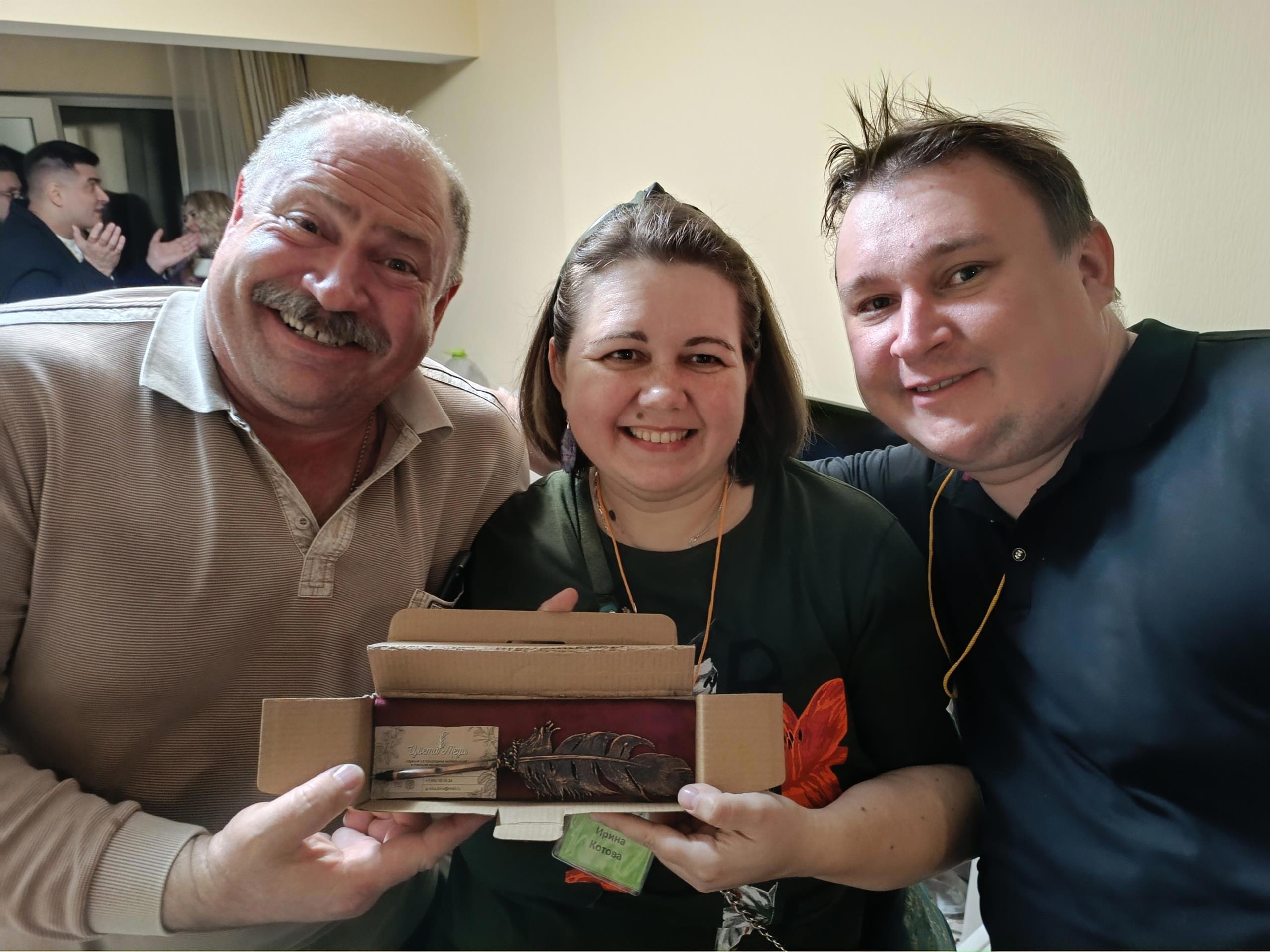 Потом Антон подарил от них с супругой, которая давняя моя читательница, настоящее кованое писательское перо. На фото его мне помогают держать Константин Калбазов и Евгений Бергер.