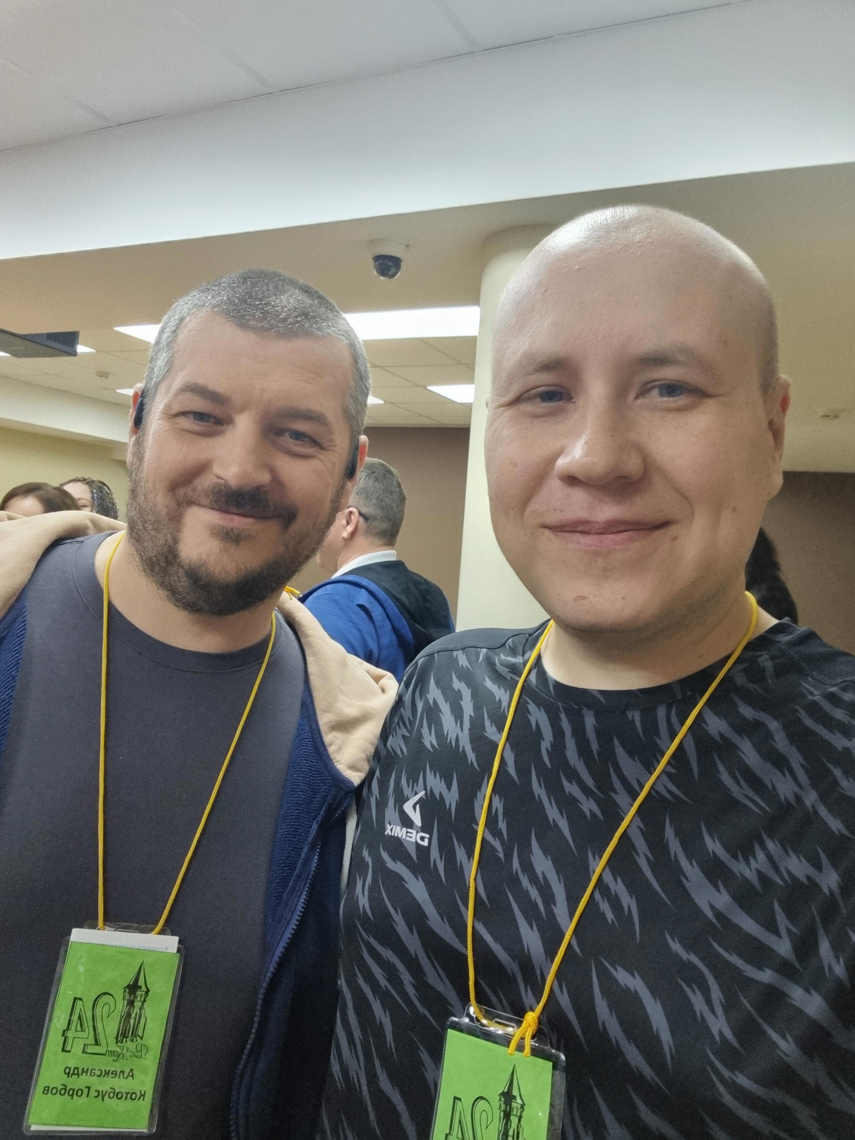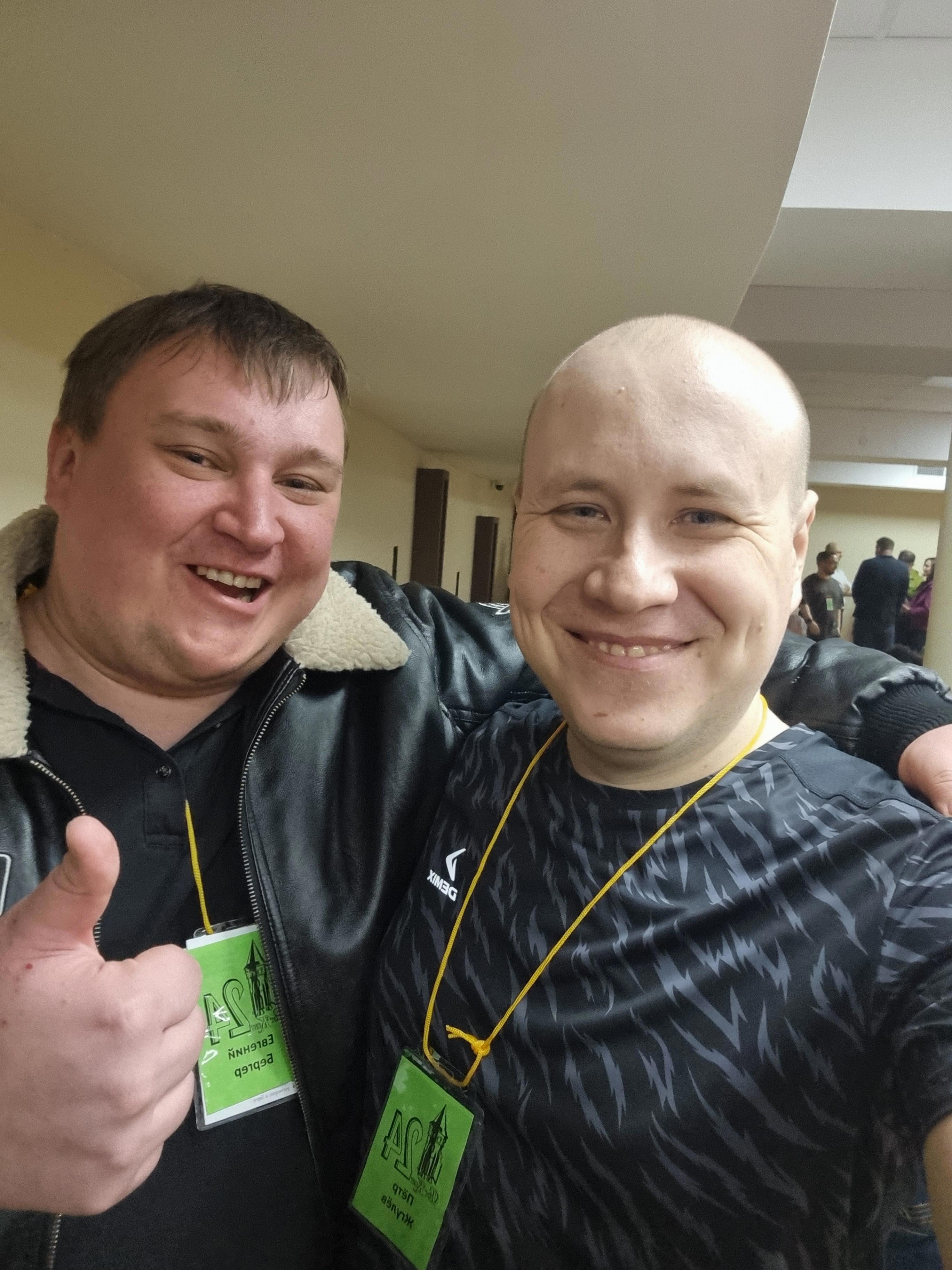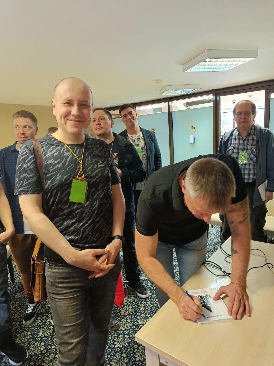 К этому моменту меня уже вырубало, поэтому я пошёл поспать хотя бы пару часов. Проснувшись где-то в девять, я понял что совершенно не хочу вставать с кровати - желательно до утра, но глянув чат - резко передумал. Потому что на Роскон наконец-то приехал из госпиталя Сергей Ким - член АЛКО-проды и человек, с которым я по сети знаком многие годы. Причём не один, а с девушкой, так что я экстренно стал и пошел вниз - успел в последние секунды, там мы его собственно всей толпой и встретили. Было громко)
