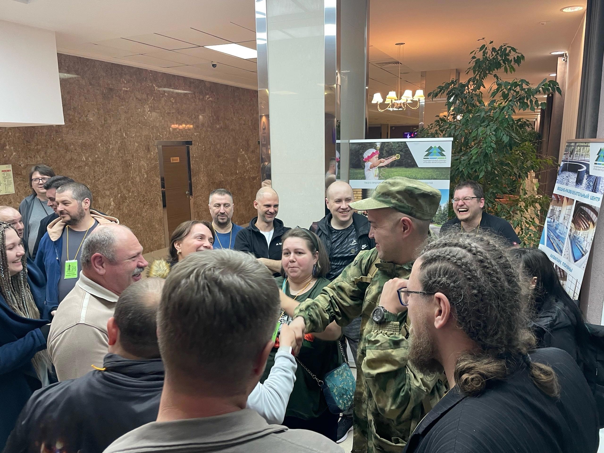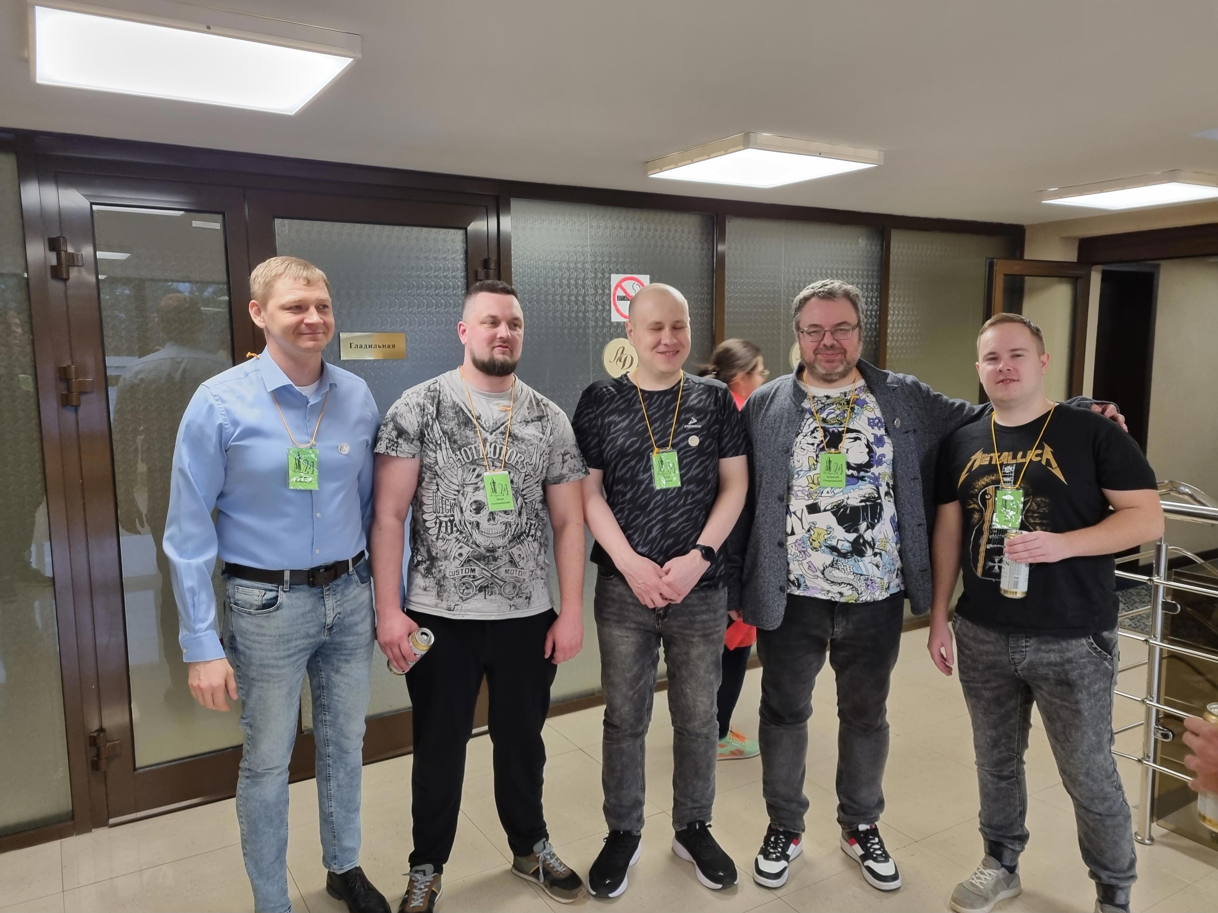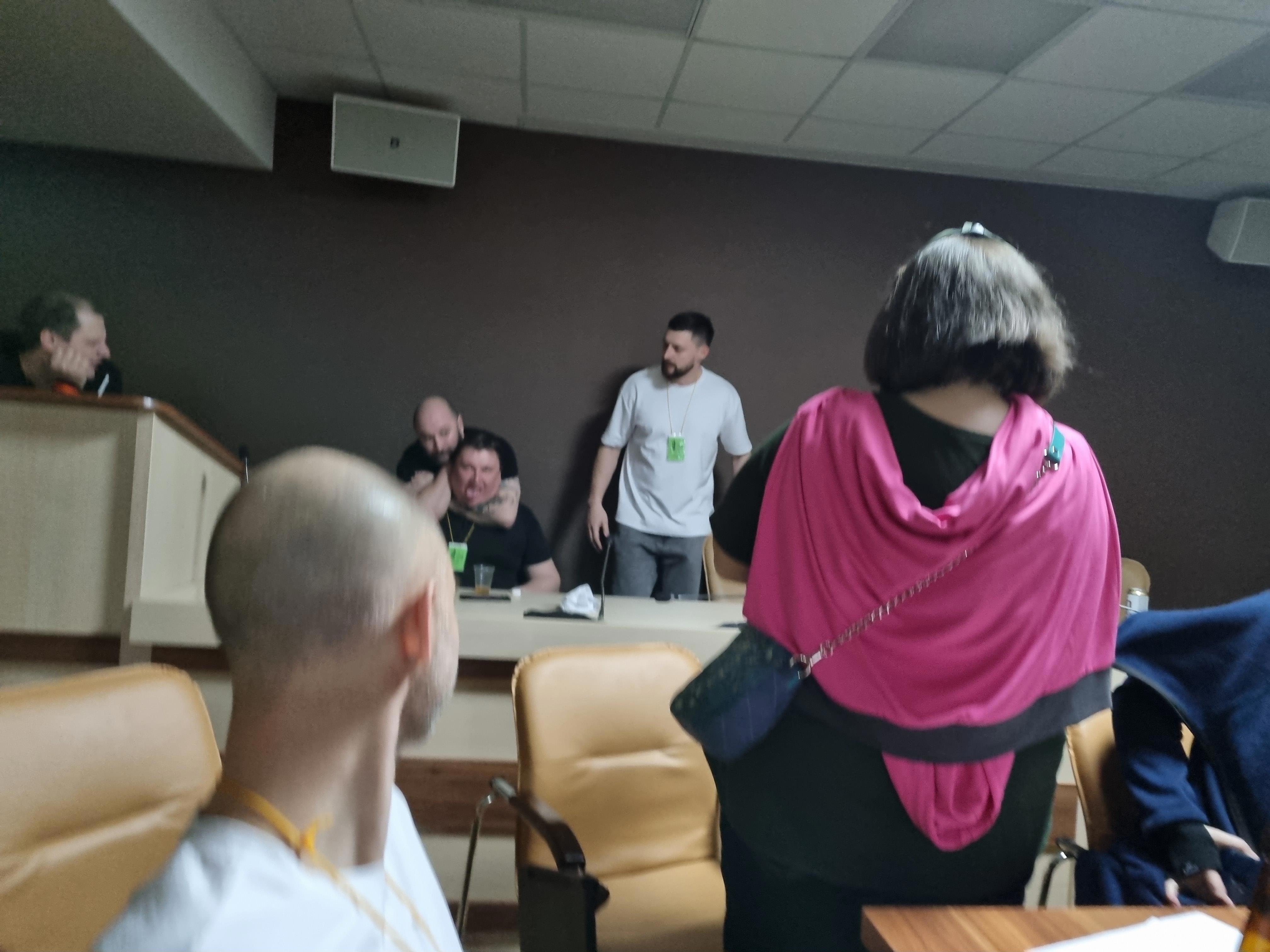 К этому моменту меня уже вырубало, поэтому я пошёл поспать хотя бы пару часов. Проснувшись где-то в девять, я понял что совершенно не хочу вставать с кровати - желательно до утра, но глянув чат - резко передумал. Потому что на Роскон наконец-то приехал из госпиталя Сергей Ким - член АЛКО-проды и человек, с которым я по сети знаком многие годы. Причём не один, а с девушкой, так что я экстренно стал и пошел вниз - успел в последние секунды, там мы его собственно всей толпой и встретили. Было громко)