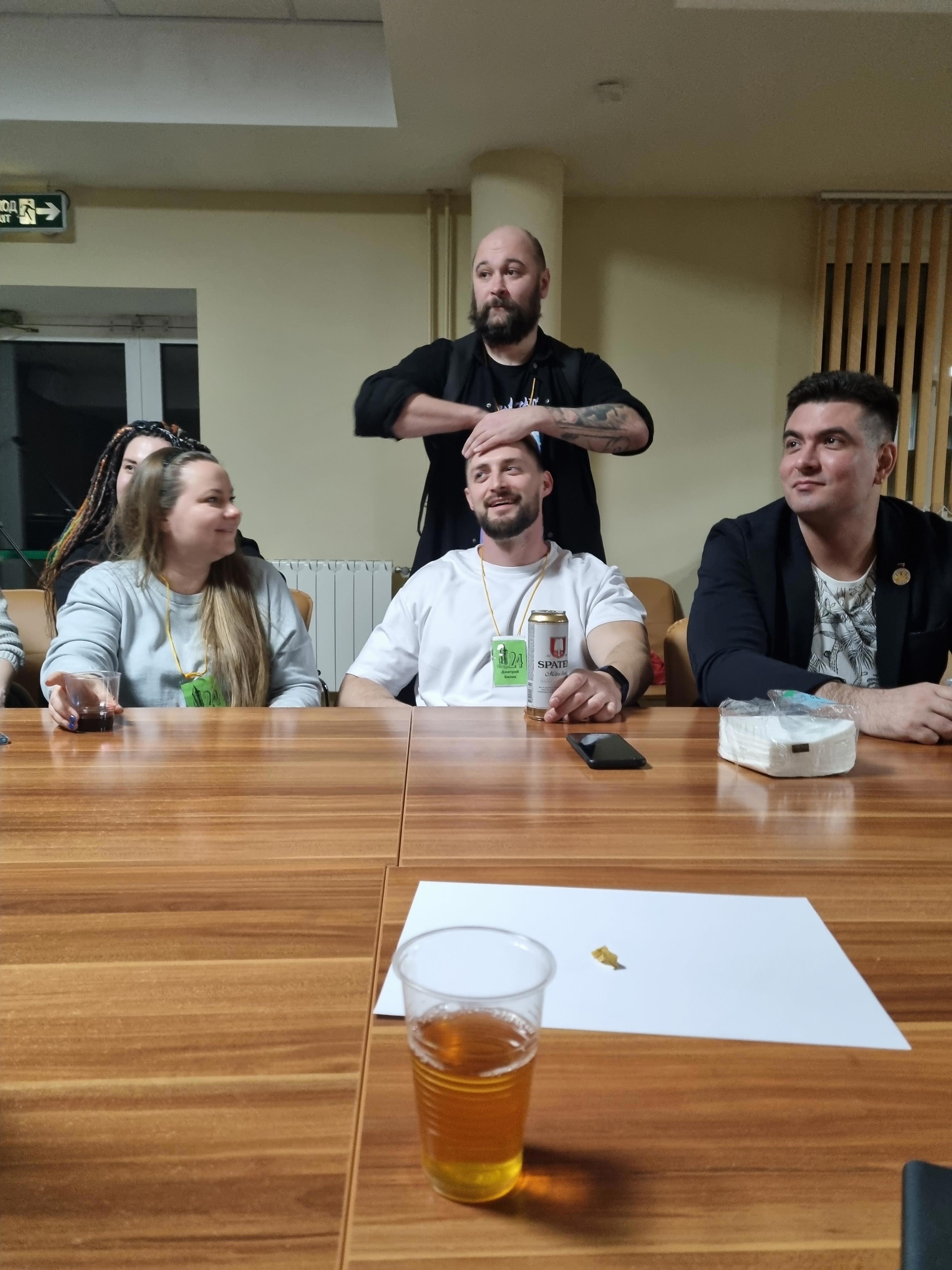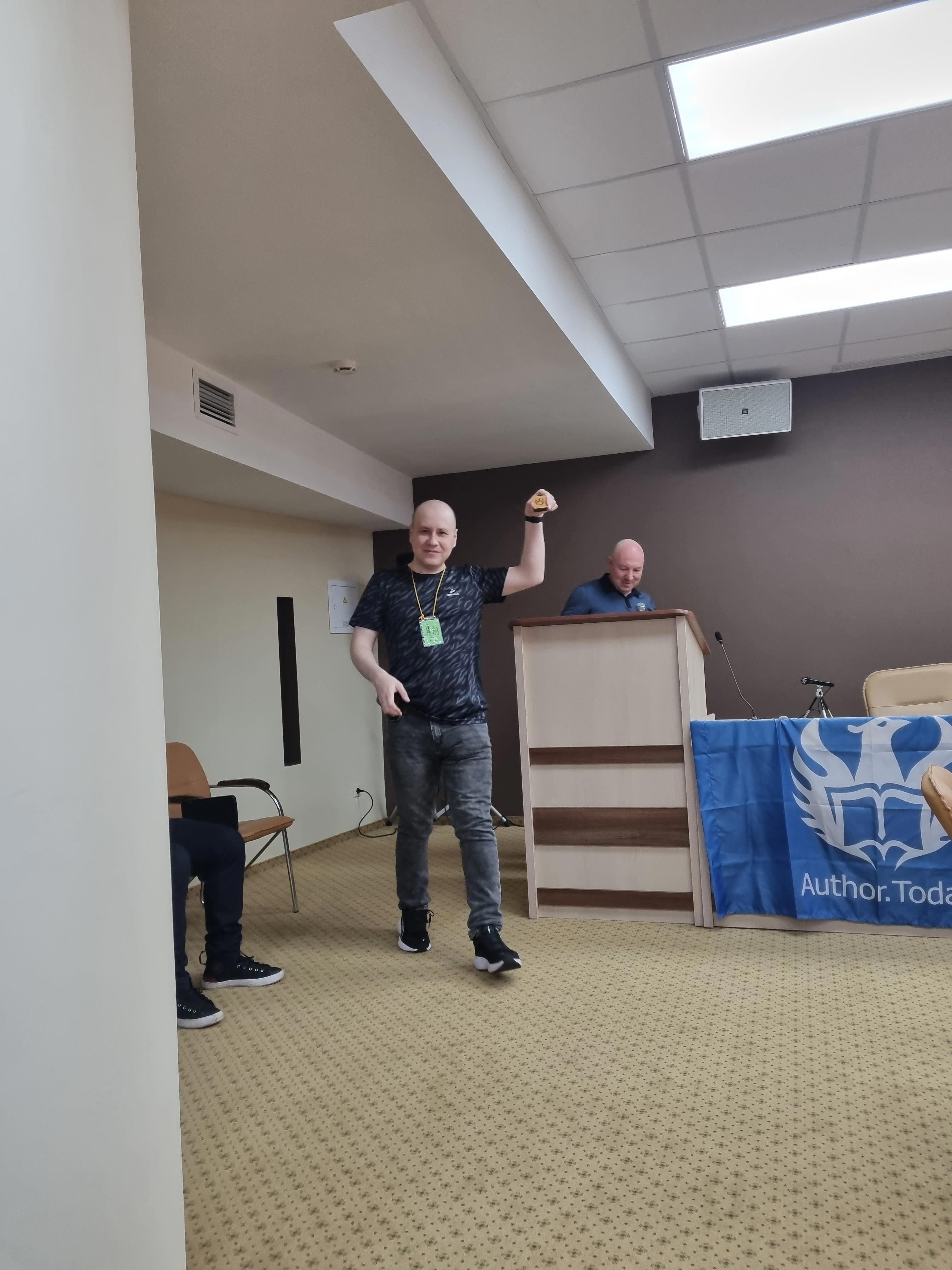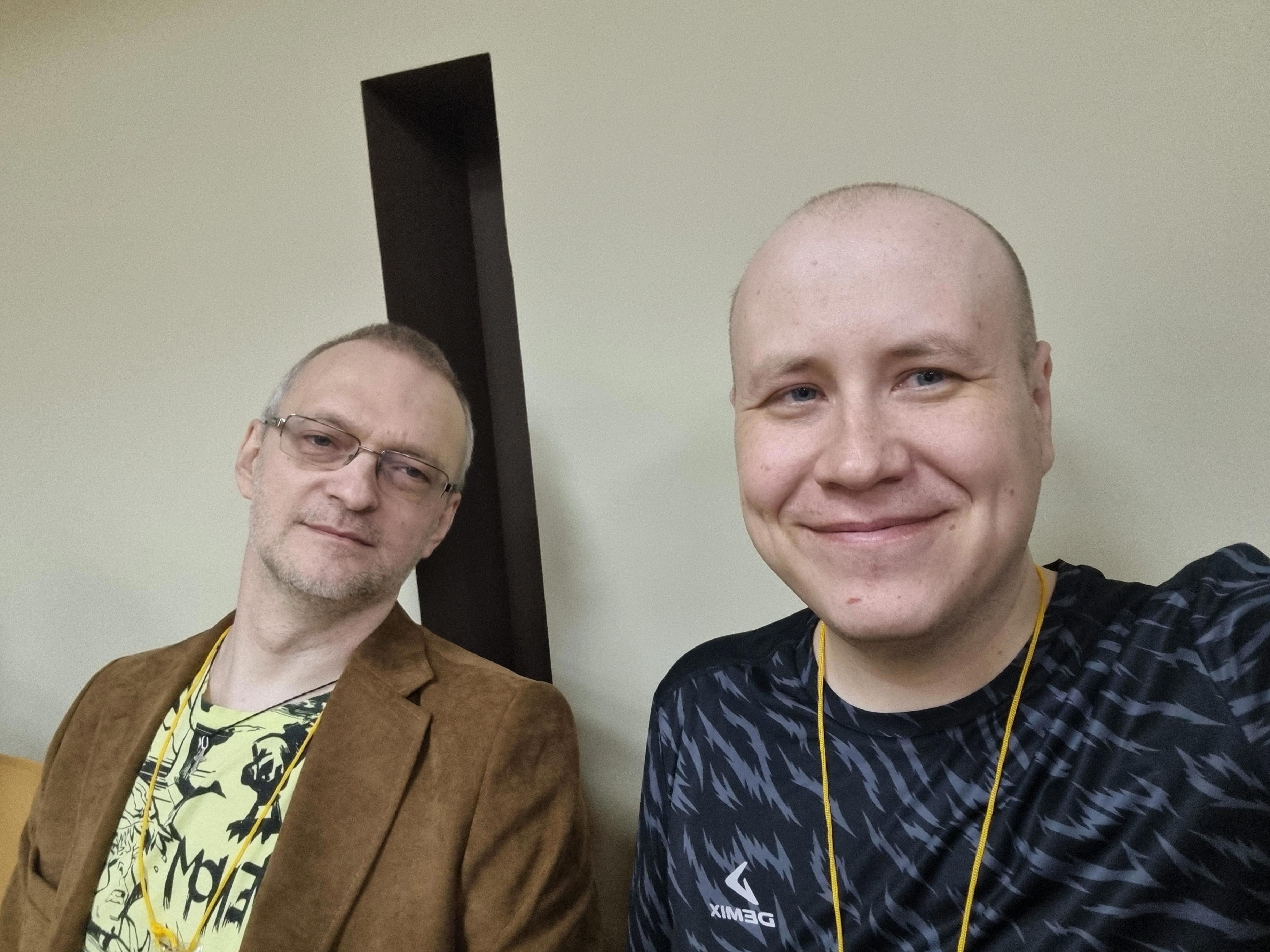 На конвенте так же присутствовал Павел Кутрис, автор Фраккийца - серии, которая входит в мультивселенную города гоблинов. Удивительно, но мы только сейчас, на второй день, смогли пересечься в столовой, немного пообщались и сделали совместное фото. Но поскольку он слегка шифруется, то вам я его не покажу)