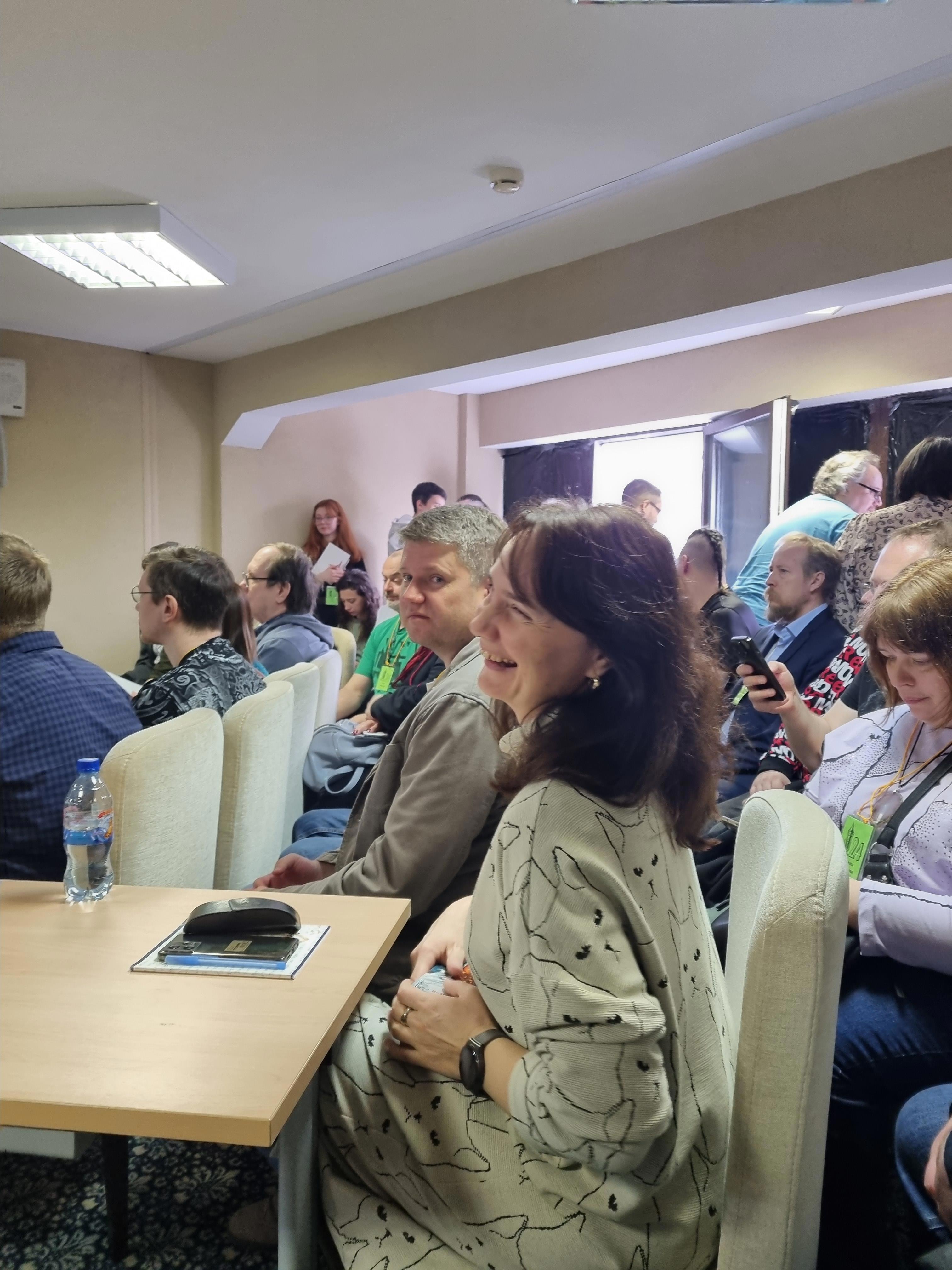 Вообще, проблема в том, что мероприятия идут параллельно и каждый раз нужно выбирать, кого ты хочешь послушать. Иногда выбор сложен, а иногда - наоборот и можно пойти поспать или поработать. В данном случае я пошёл к Панову - в своей время я прочитал немало его книг, поэтому было интересно встретиться лично. Собственно, подобного мнения придерживался не только я, поэтому небольшая аудитория была забита и я предпочел постоять.