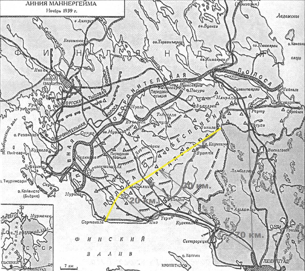Советские предложения на третьем раунде переговоров. Граница должна была проходить в 20 километрах от форта Ино, в 30 километрах от старой границы и в 70 километрах от Ленинграда. Все эти километры это одна линия.