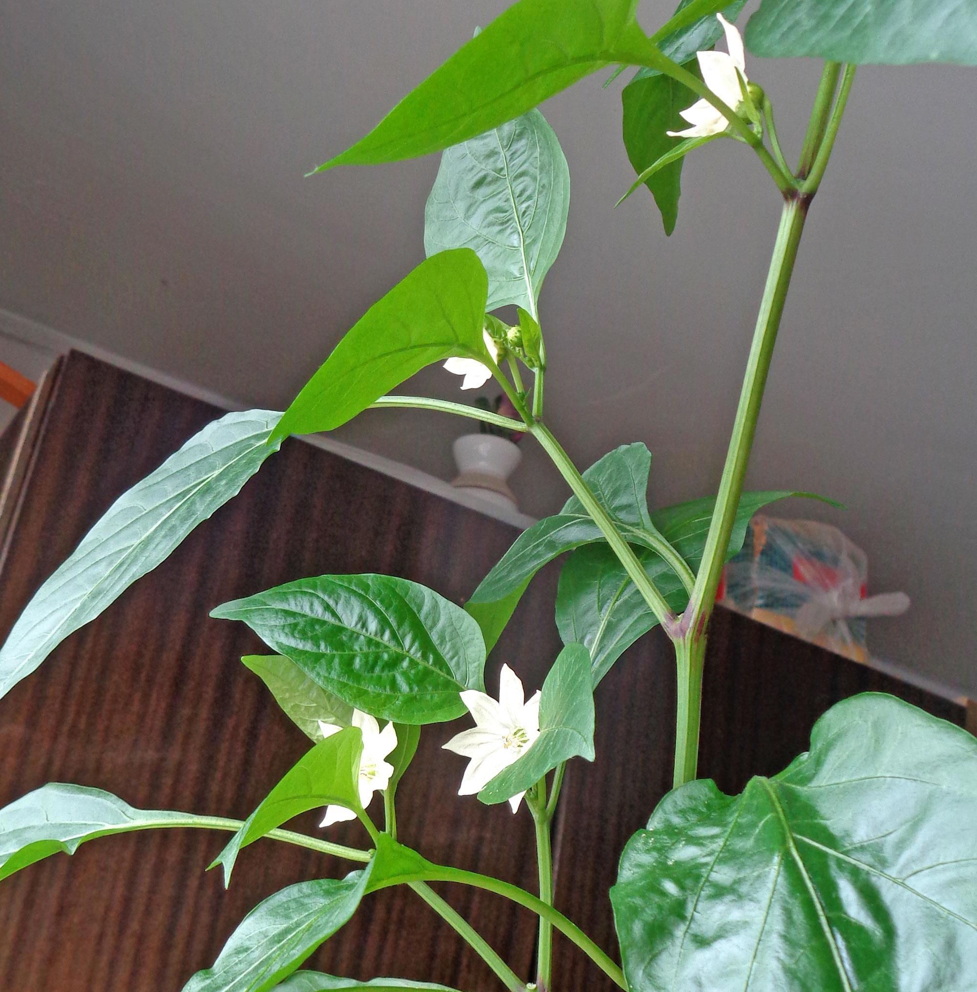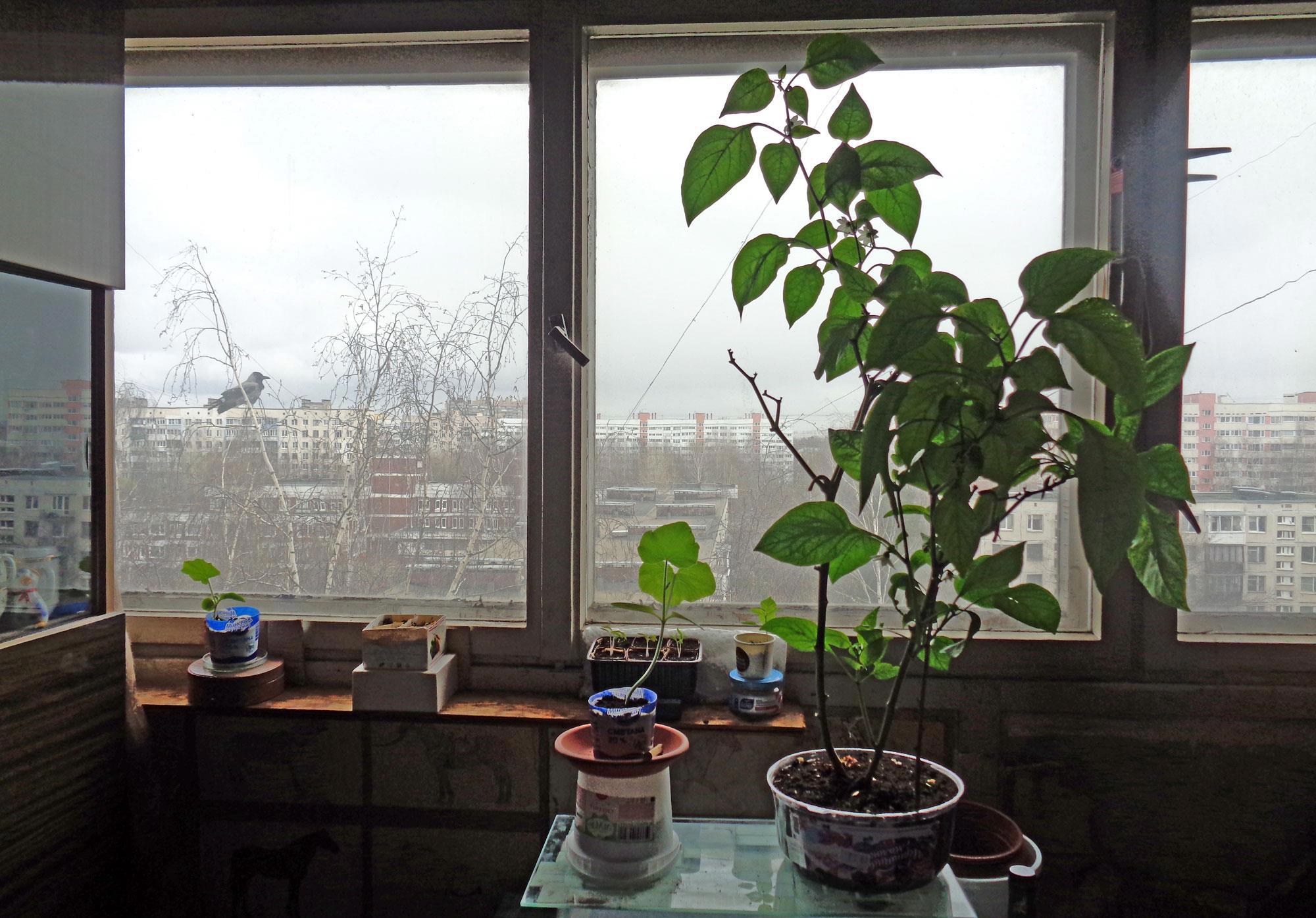 В комнате, где жил Котик (да, у него была своя комната), теперь растут мои эксперименты. Особенно интересно вымахали прошлогодние перцы, выращенные из семян сладкого перчика, купленного в овощном отделе. Они вообще однолетние, мне просто жаль было выбрасывать. Голые палки простояли всю зиму и вдруг зазеленели. Теперь это солидный и очень бодрый куст.