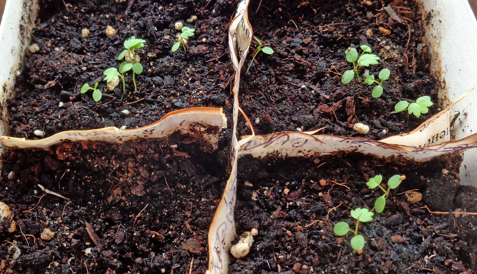 Семена такие мелкие, что не получилось посадить по одному. Пока что эта мелочёвка видна только "под микроскопом". Но растут. Поглядим, что получится. Может, всё-таки вырастут в нормальную величину, когда солнышко пригреет.