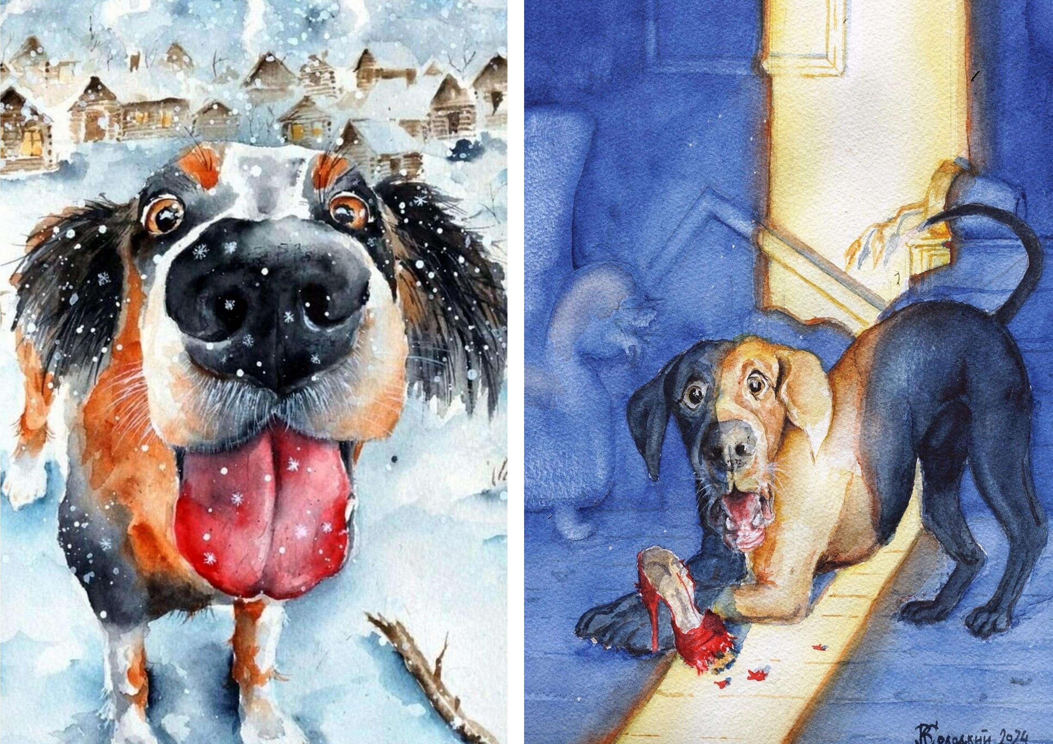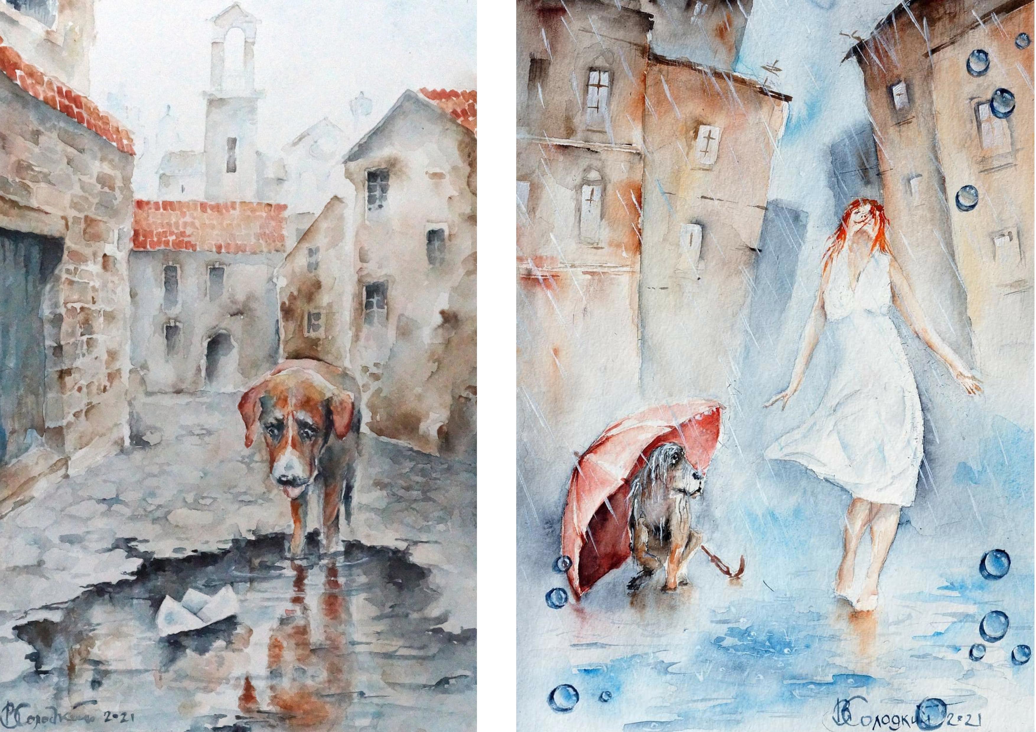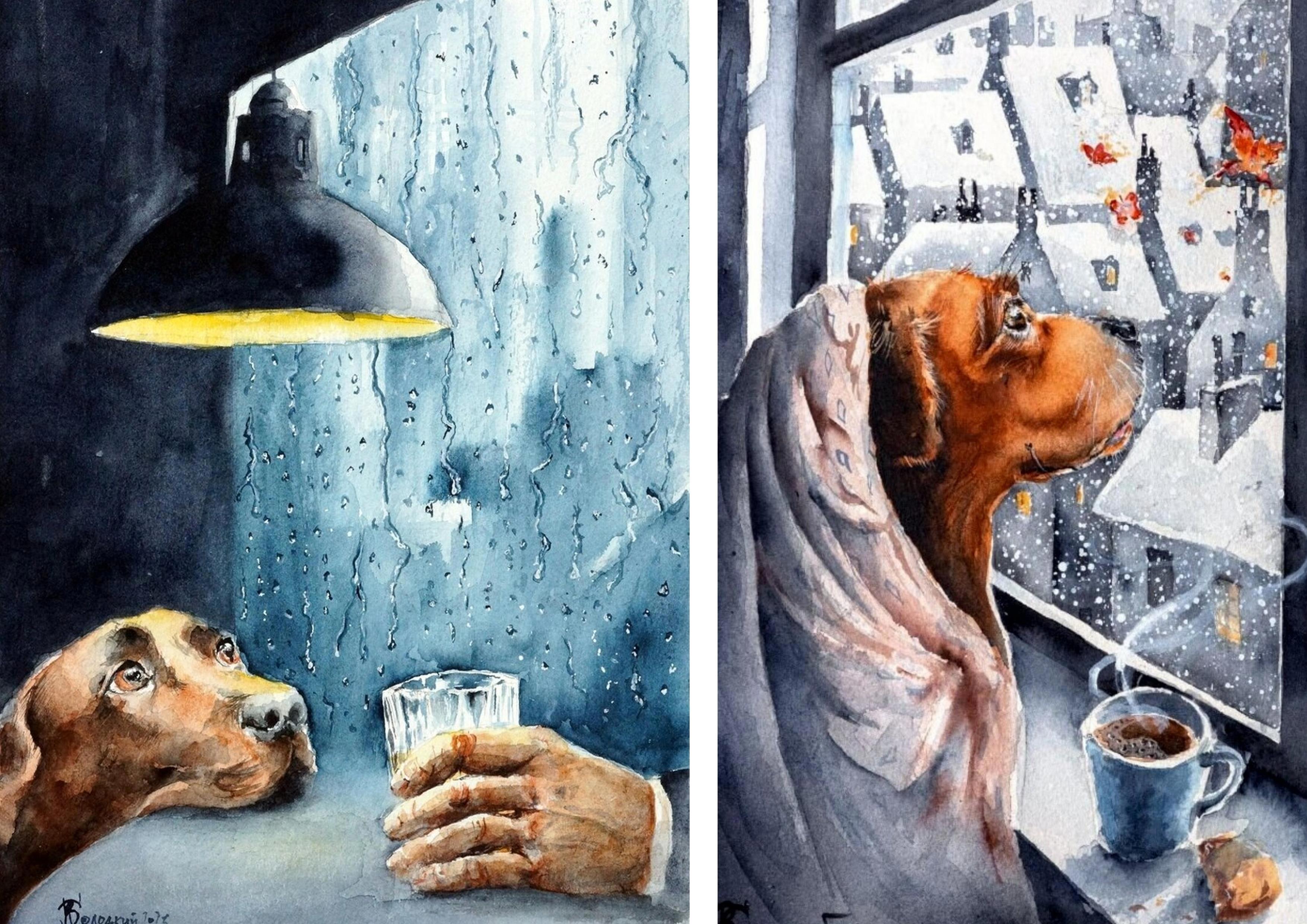 Автор: ЛилияДрузья, сегодня хочу, чтобы вы получили кучу удовольствия от акварелей Вадима Солодкого. На них всё очень понятно без слов и сразу. Одни из них заставят улыбаться, другие грустить и сочувствовать, некоторые задуматься. Их просто переполняют эмоции! И эти эмоции летят прямо в сердце... Меня очень тронула работа, где собака смотрит на хозяина, держащего стакан в руке. Сразу подумала, что хозяин только что принял лекарство, а пёс поддерживает его, хочет сказать, что он выздоровеет и всё будет как прежде, прогулки, игры...