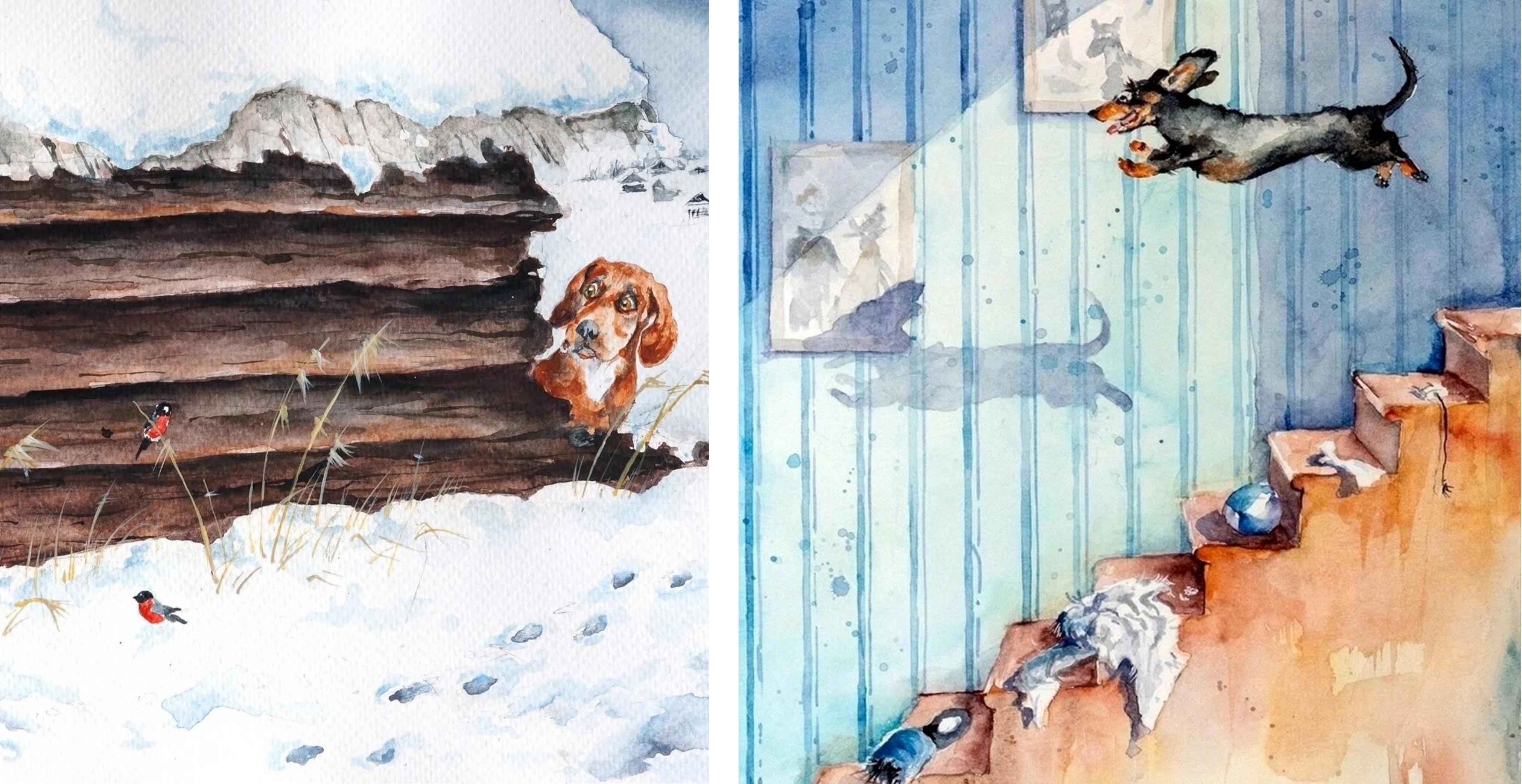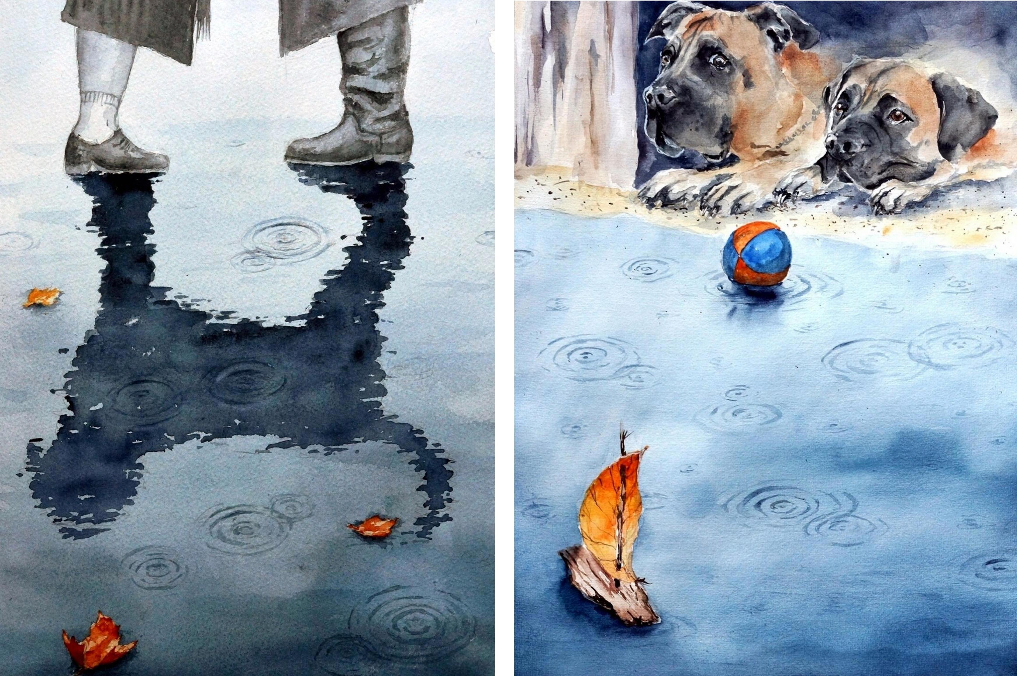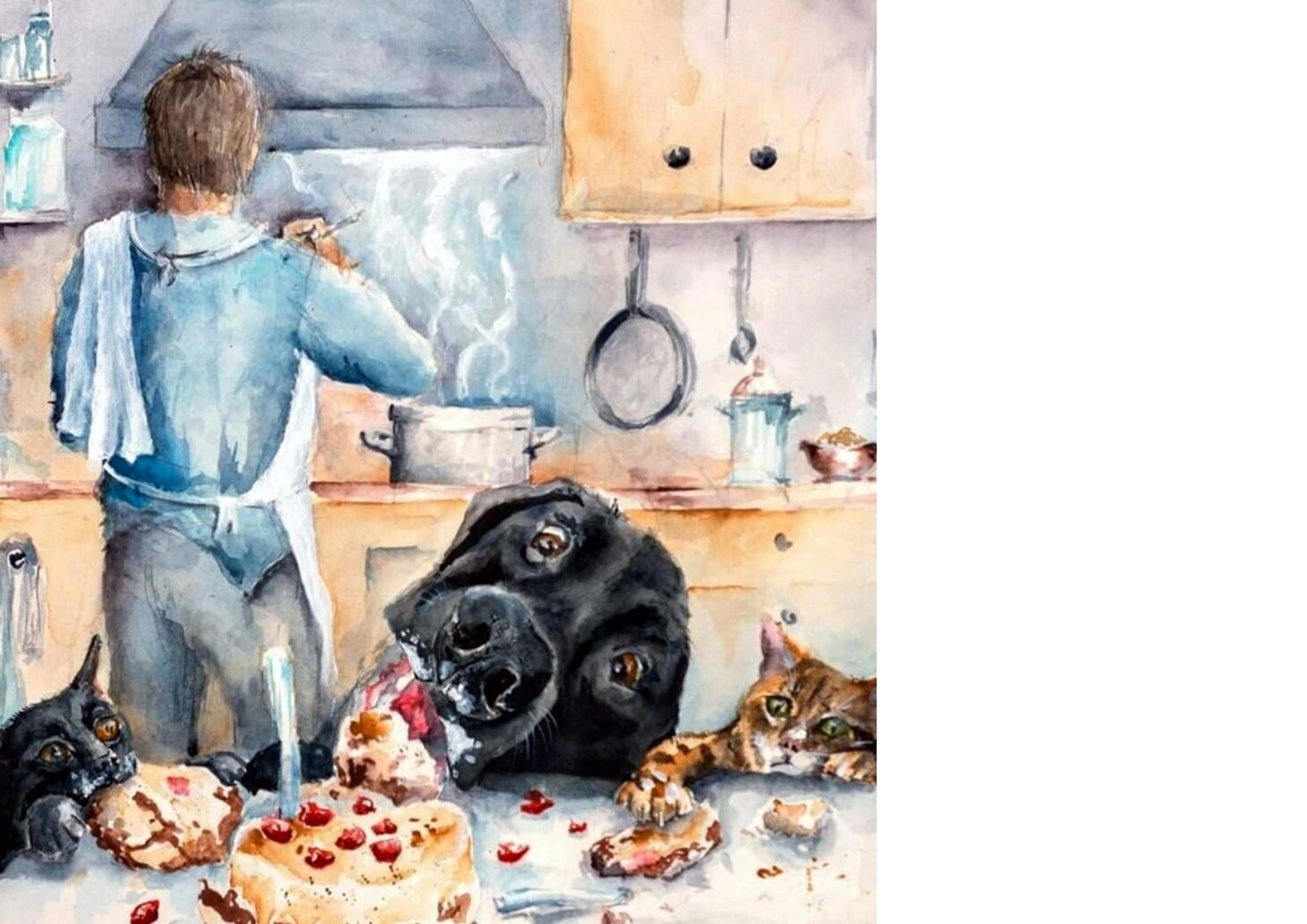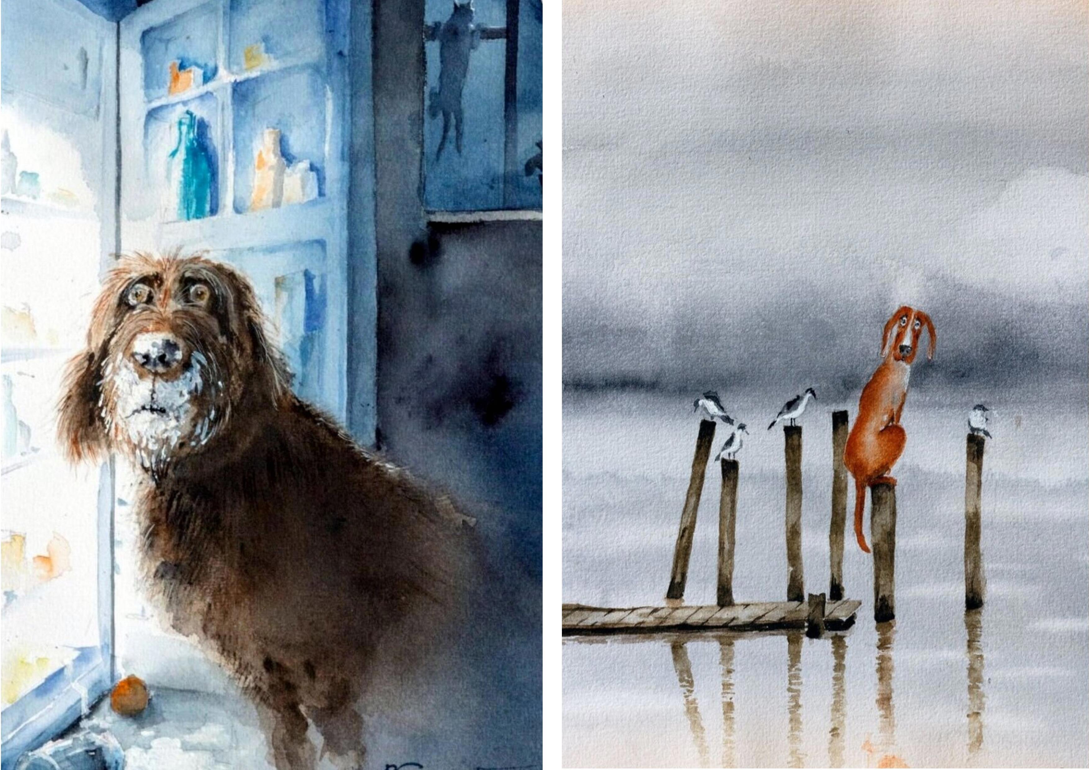 Автор: ЛилияДрузья, сегодня хочу, чтобы вы получили кучу удовольствия от акварелей Вадима Солодкого. На них всё очень понятно без слов и сразу. Одни из них заставят улыбаться, другие грустить и сочувствовать, некоторые задуматься. Их просто переполняют эмоции! И эти эмоции летят прямо в сердце... Меня очень тронула работа, где собака смотрит на хозяина, держащего стакан в руке. Сразу подумала, что хозяин только что принял лекарство, а пёс поддерживает его, хочет сказать, что он выздоровеет и всё будет как прежде, прогулки, игры...