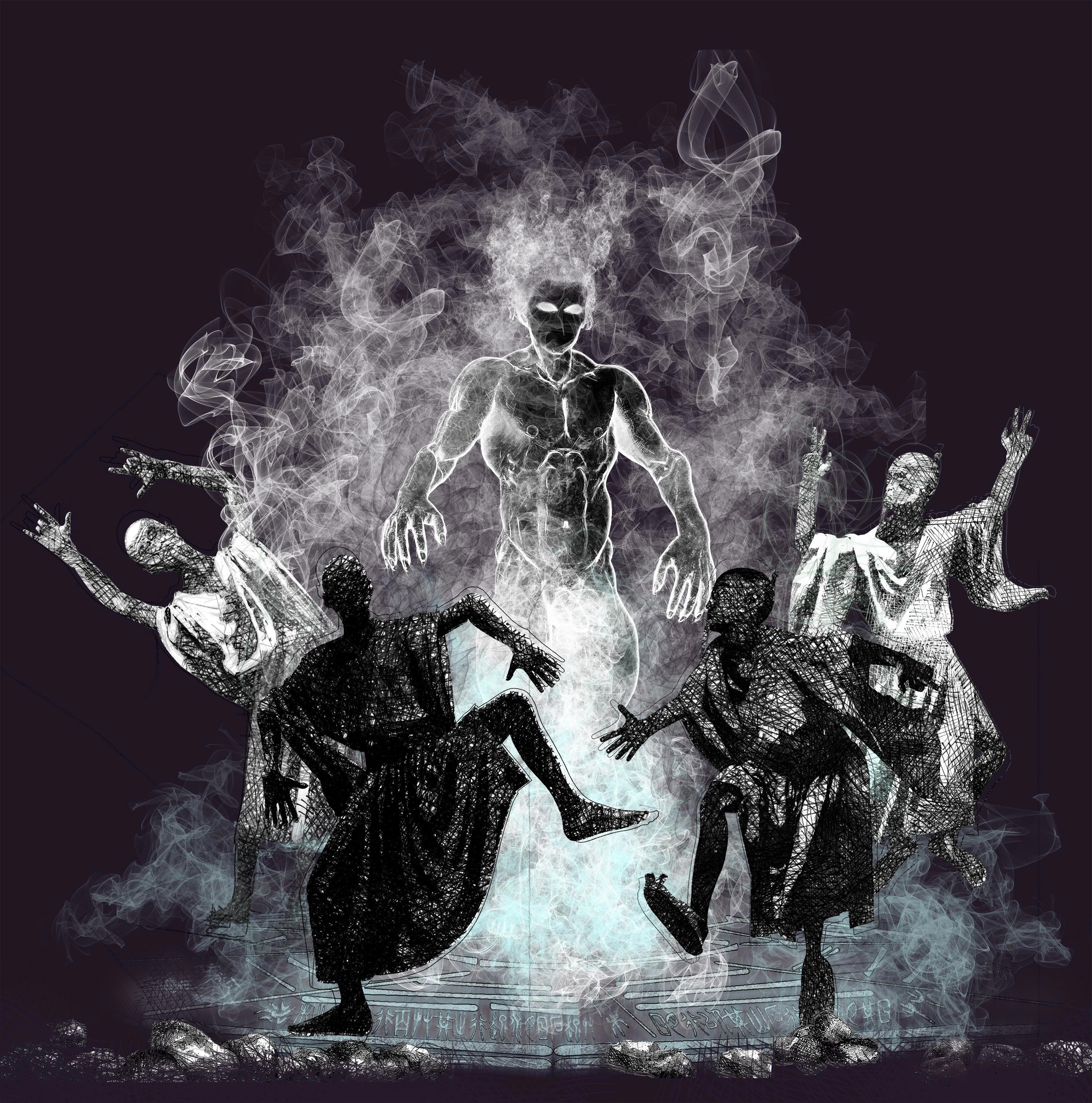 Черный туман тянулся прозрачными нитями и завивался, как водоворот, в центре печати. У него появилась голова со светящимися глазами. Голова повернулась туда и сюда.