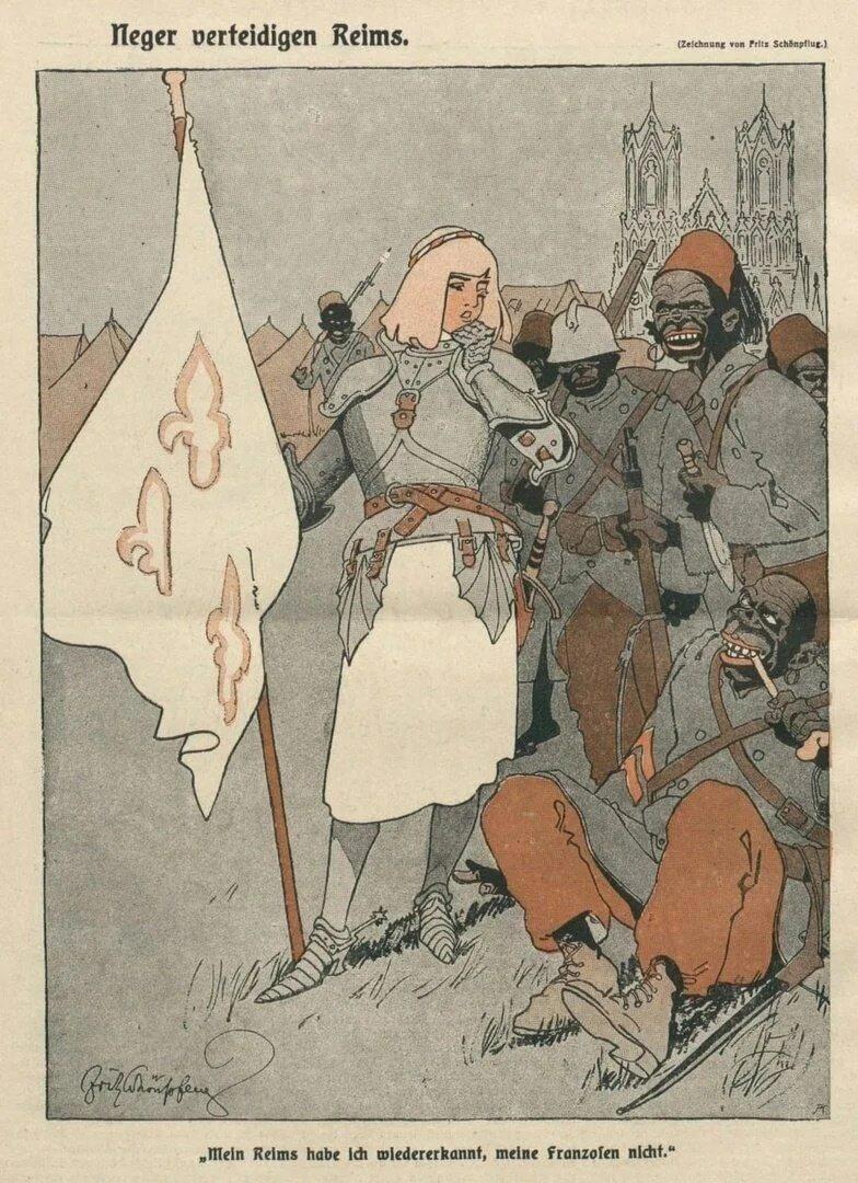 Пророческая немецкая карикатура времен ПМВ. Жанна Дарк собирает французское войско. Хотя сейчас и немцы такие же...