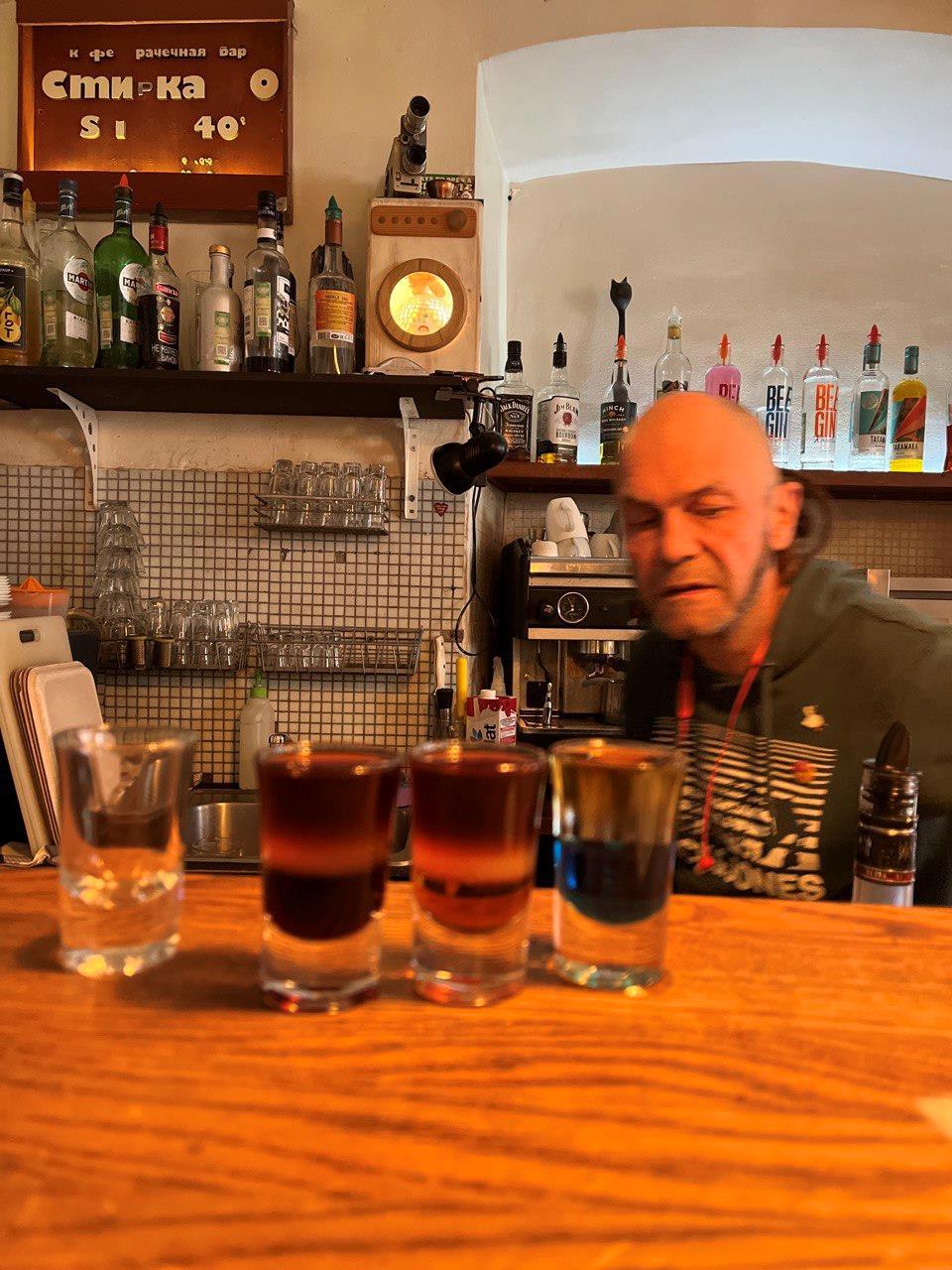 Хотела сфотографировать шоты, а в кадр попал и бармен. Меню, мне кажется, не обновлялось последние лет 5.